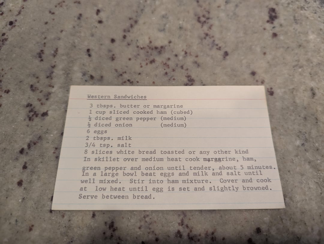 Some of these recipes are from the great depression, and others were copied from magazines in the 1970s. As for this one, which is basically a western omelette as a sandwich, there's no date or reference to the creator 🙁
