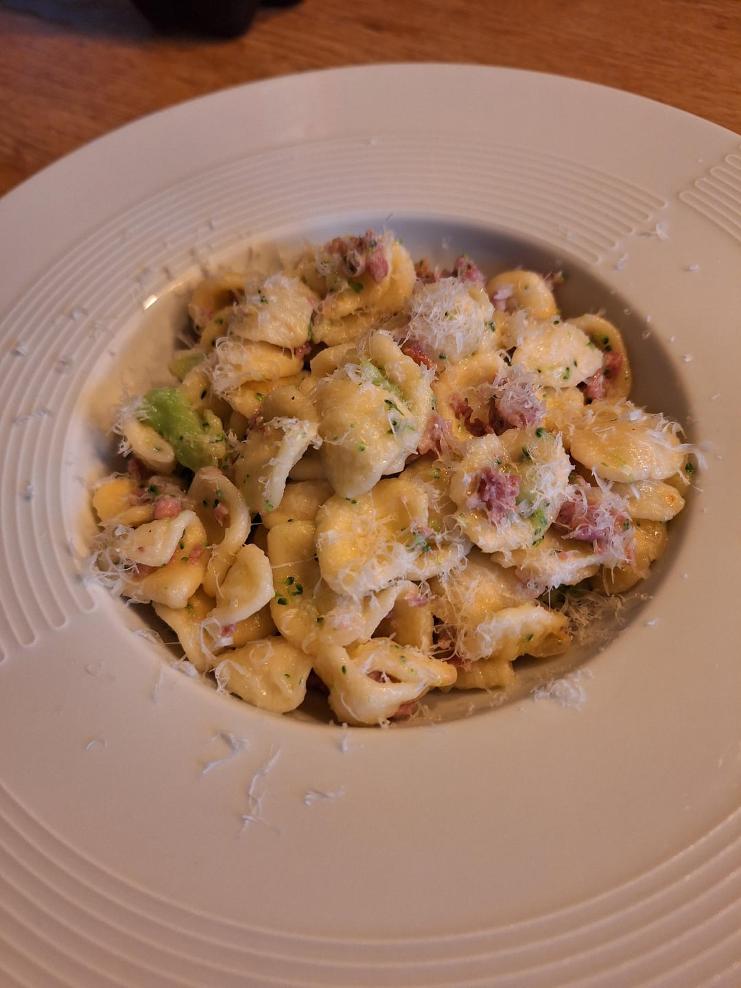 Added the boiled orrechiette and broccoli and mixed it well. Added some freshly grated parmagiano reggiano and tossed it.