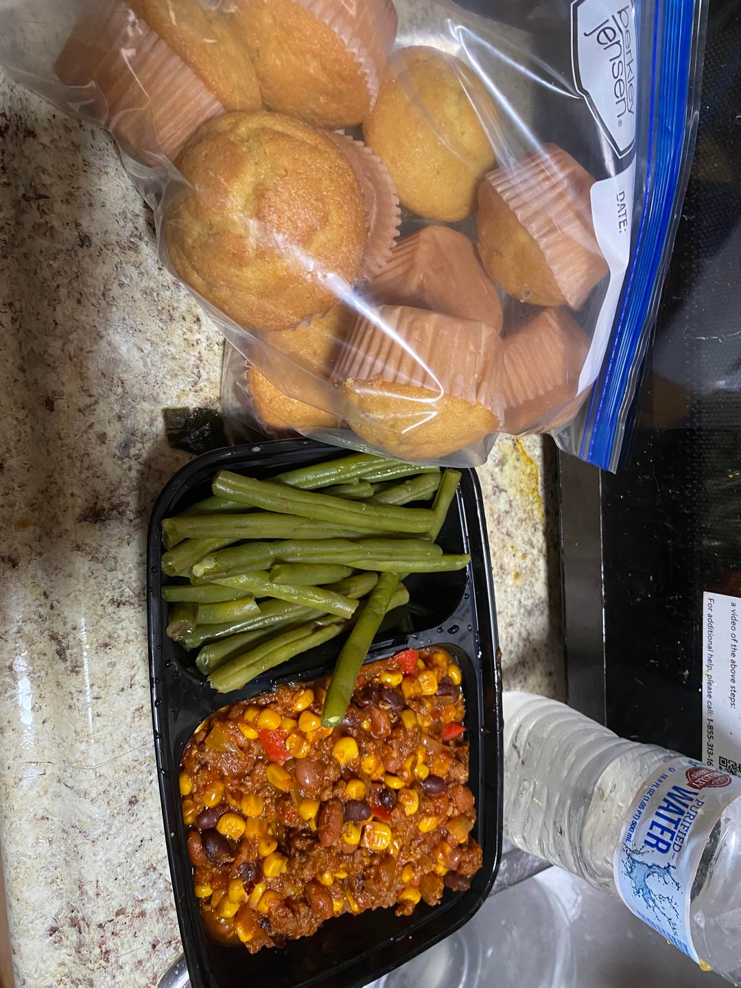 5) Slow Cooker Turkey Chili with Steamed Green Beans and Homemade Sweet Cornbread Muffins.