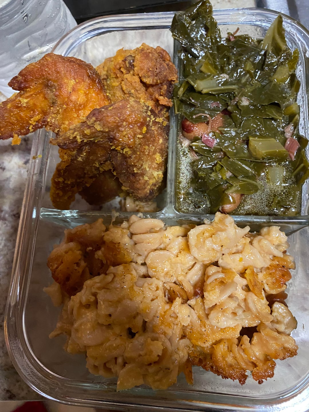 4) Fried Chicken with Baked Macaroni and Cheese with Slow Cooked Collard Greens.