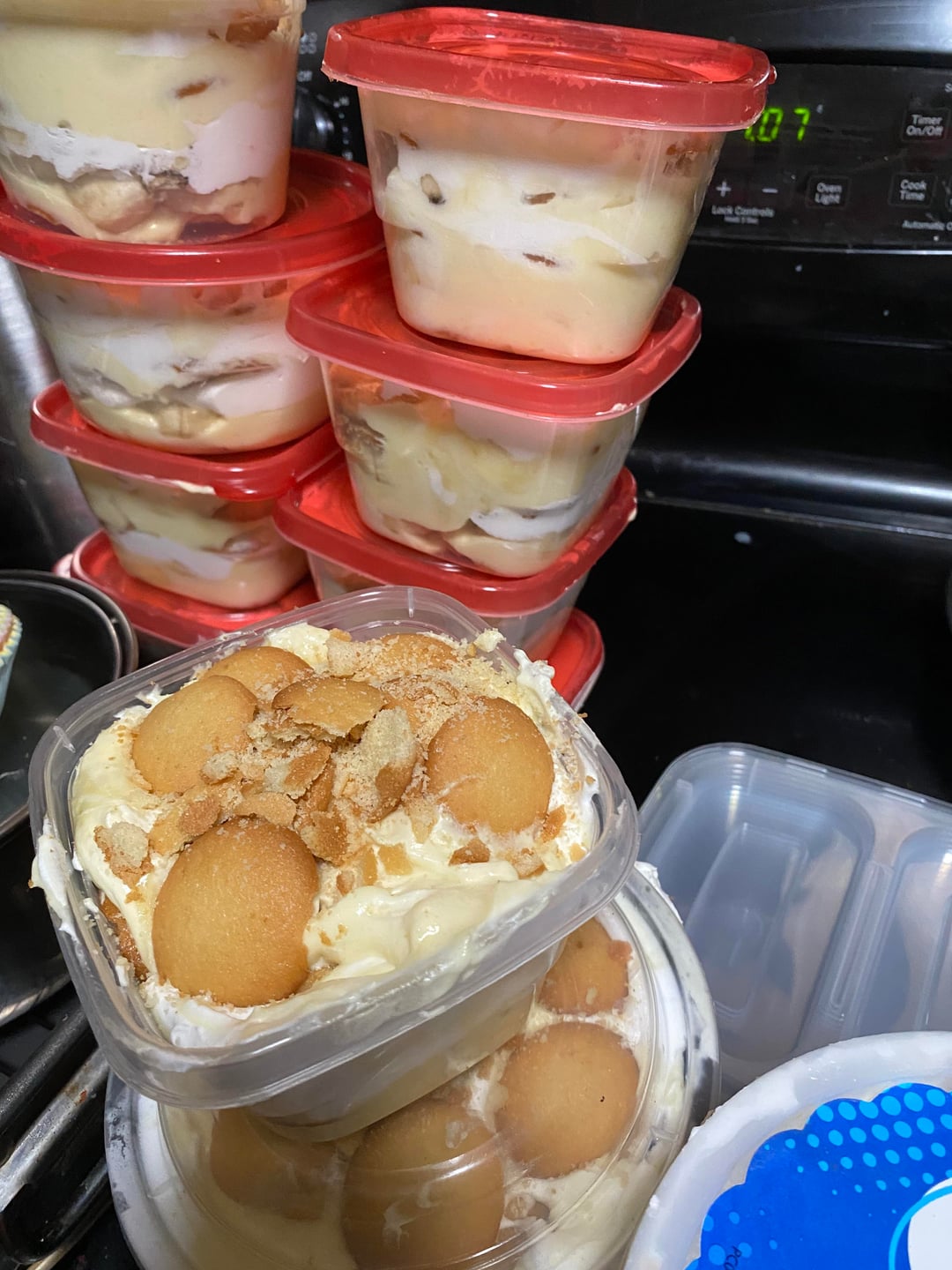 [Banana Pudding Recipe](https://www.allrecipes.com/recipe/22749/the-best-banana-pudding/) – I doubled the recipe and only used five cups of almond milk and one can of sweetened condensed milk. I also used two 5.1 oz boxes of instant banana pudding. I folded about 8 oz of the whipped topping into the pudding and made layers with the pudding, bananas, whipped topping, and wafers. I only used 7 bananas but I don’t like lots of bananas and actually ran out of banana towards the last three puddings.