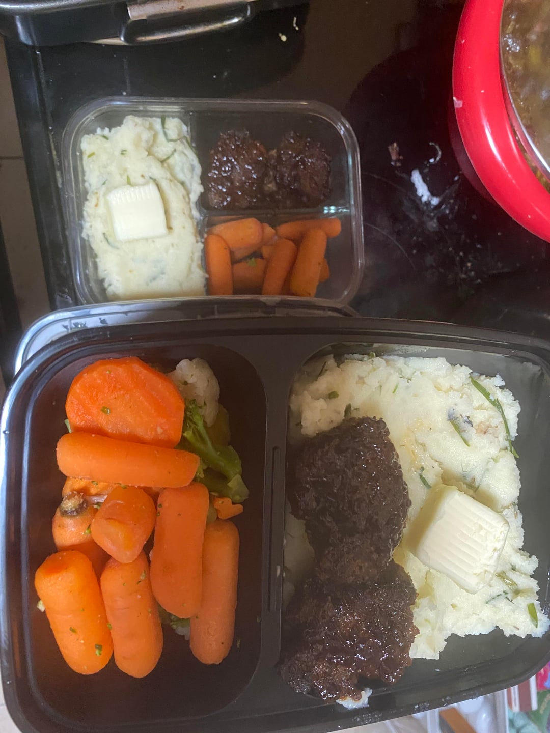 2)Meatloaf cups with Homemade Mashed Potatoes and Broccoli Normandy OR Steamed Carrots.