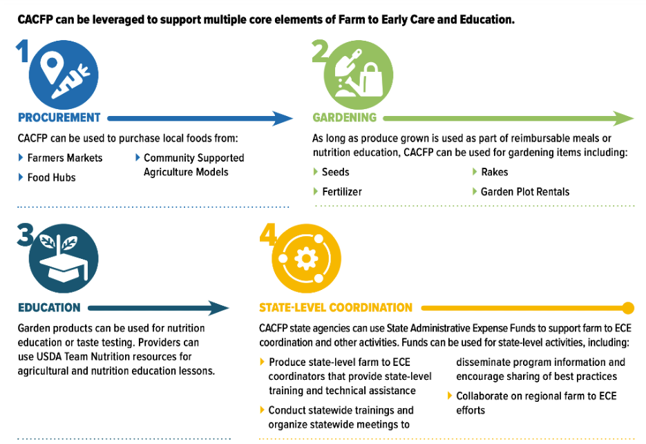 CACFP reimburses providers for meals and snacks, currently 1.5 billion meals a year. When paired with Farm to ECE, CACFP dollars can stretch further by: