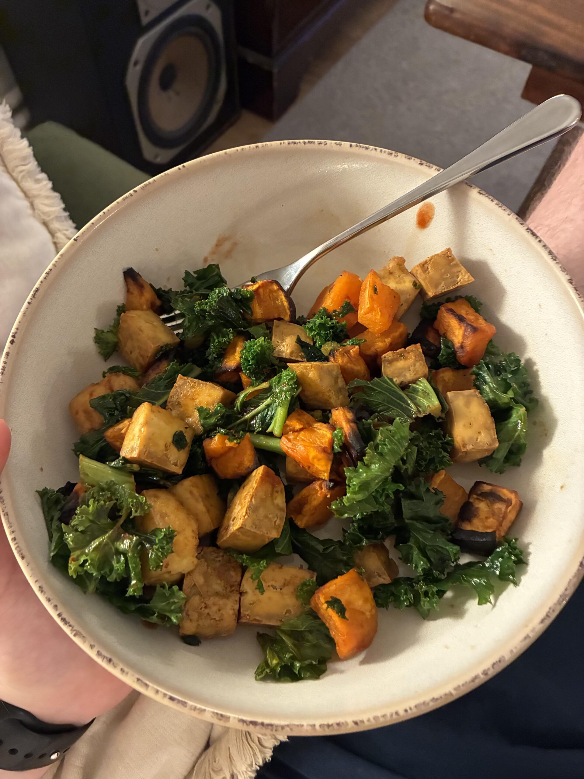 Would love to know everyone's easy nutritious, delicious meals, for me it's this simple tofu, sweet potato and kale fry up with home made sriracha.