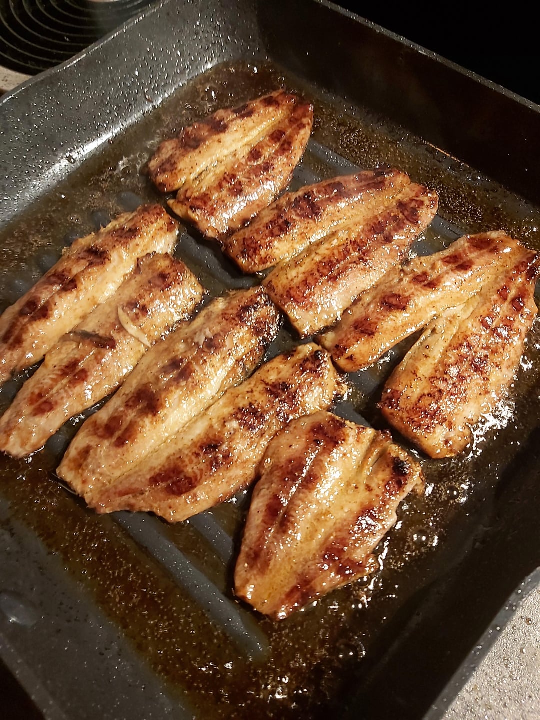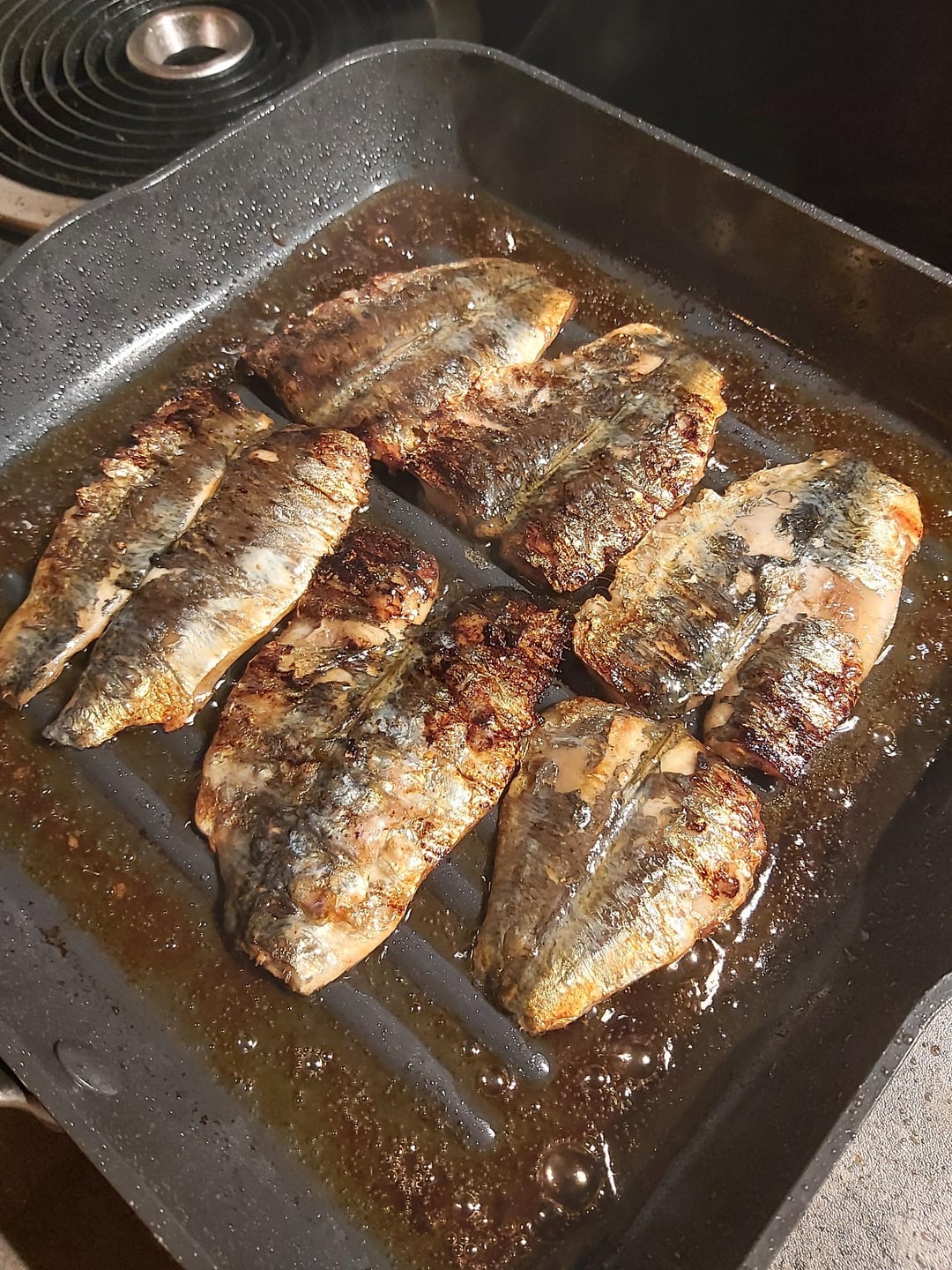 2: Cook the sardines in a (grill)pan with some (olive) oil. Season straight away with some soy sauce.