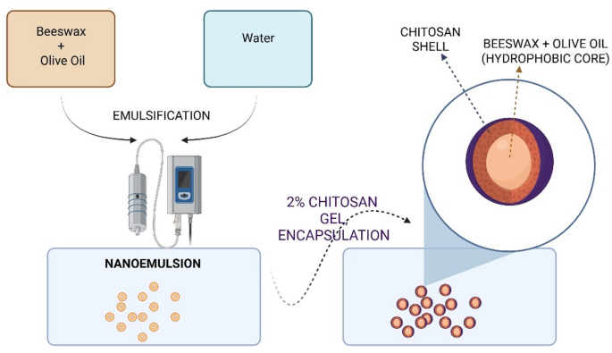At the molecular level, interactions between beeswax and chitosan can occur through several mechanisms that affect the physicochemical and functional properties of the resulting complexes or composites. Beeswax is a mixture of hydrophobic compounds (mainly fatty acid esters and hydrocarbons), and is soluble in oils. Chitosan, conversely, is hydrophilic due to the presence of amino (–NH2) and hydroxyl (–OH) groups, and undergoes protonation (the transition from –NH2 to –NH3+) in an acidic environment, which gives it a positive charge. Following sonication, the wax molecules, dissolved in the oil, form an emulsion. Subsequently, a layer of chitosan is formed around the nanoemulsion droplets, thereby stabilising the wax/oil emulsions and forming capsules with a hydrophobic core (wax/oil) and a polymer coating (chitosan).Results from electron microscopy and FTIR-ATR studies confirm the proposed nanocapsule structure (Fig. 1): a hydrophobic core (beeswax and olive oil) stabilised by hydrophobic interactions, encapsulated within a chitosan coating that maintains spherical integrity via hydrogen bonding. This is corroborated by FTIR-ATR spectra, which reveal molecular interactions between components through peak shifts and intensity changes—notably, reduced absorption of –OH/–NH2 groups at 3257 cm−1 and altered bands at 2915 cm−1 (C–H asym. stretch), 2849 cm−1 (C–H sym. stretch), and 1744 cm−1 (C = O ester stretch).