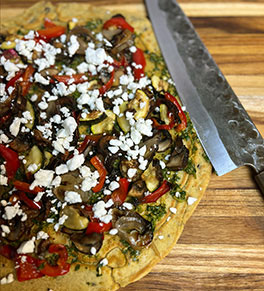 Socca, a chickpea flatbread, is covered in chermoula and healthy roasted veggies with feta cheese on top.This vibrant and flavorful flatbread recipe has an international flare, melding ingredients popular in various countries throughout the Mediterranean region, while simultaneously providing powerful brain-protective compounds.