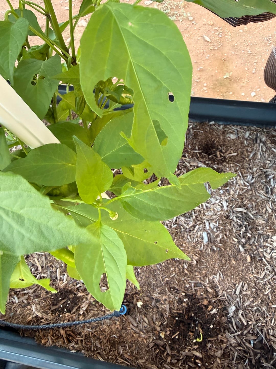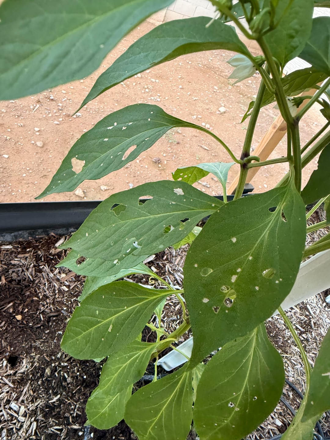 I am a very new garden starter and put some pepper seeds in a raised garden bed. My first harvest is here but I also see the leaves are getting holes in it. What could I do ? by EarComprehensive7268 Dining and Cooking