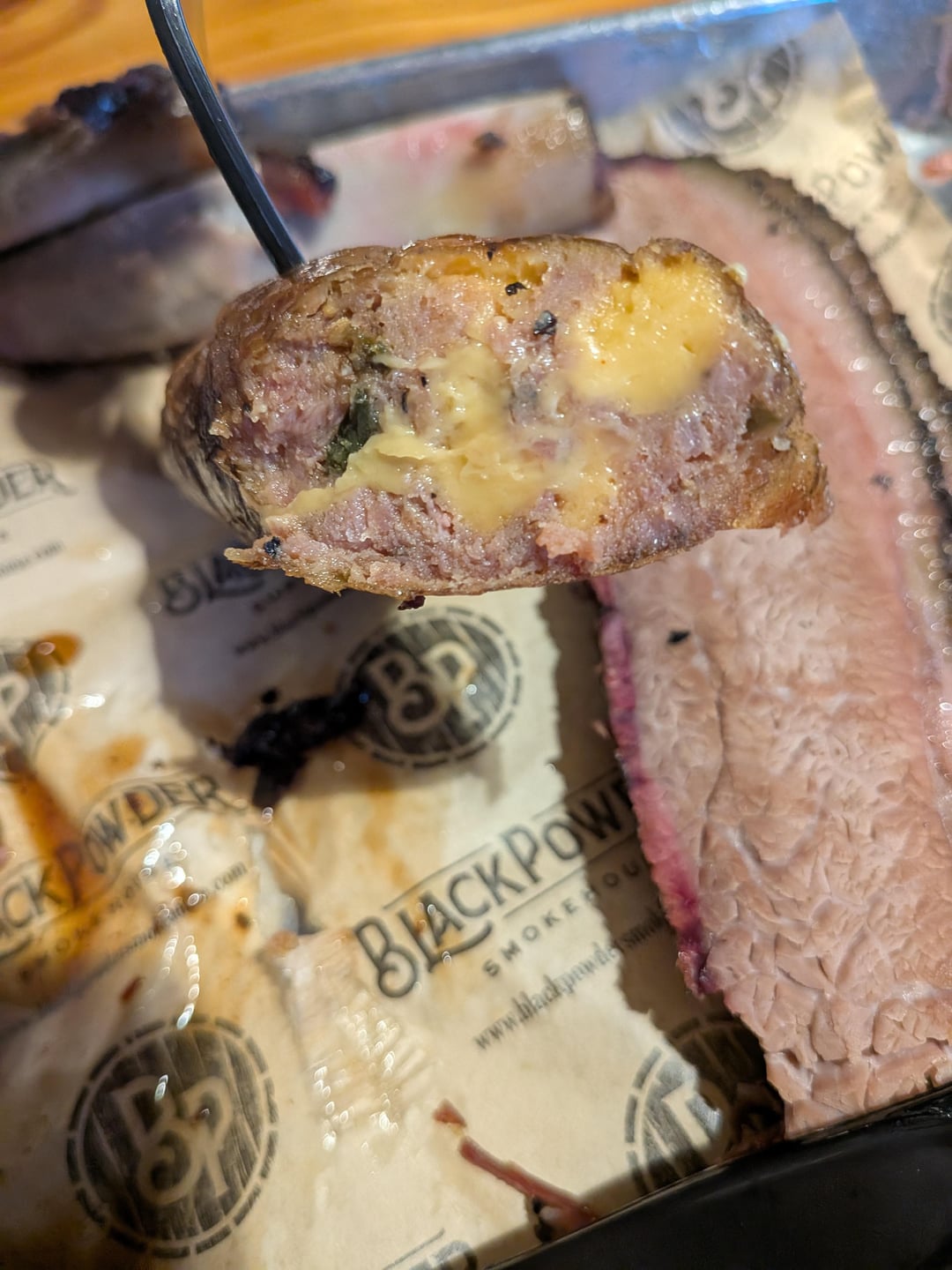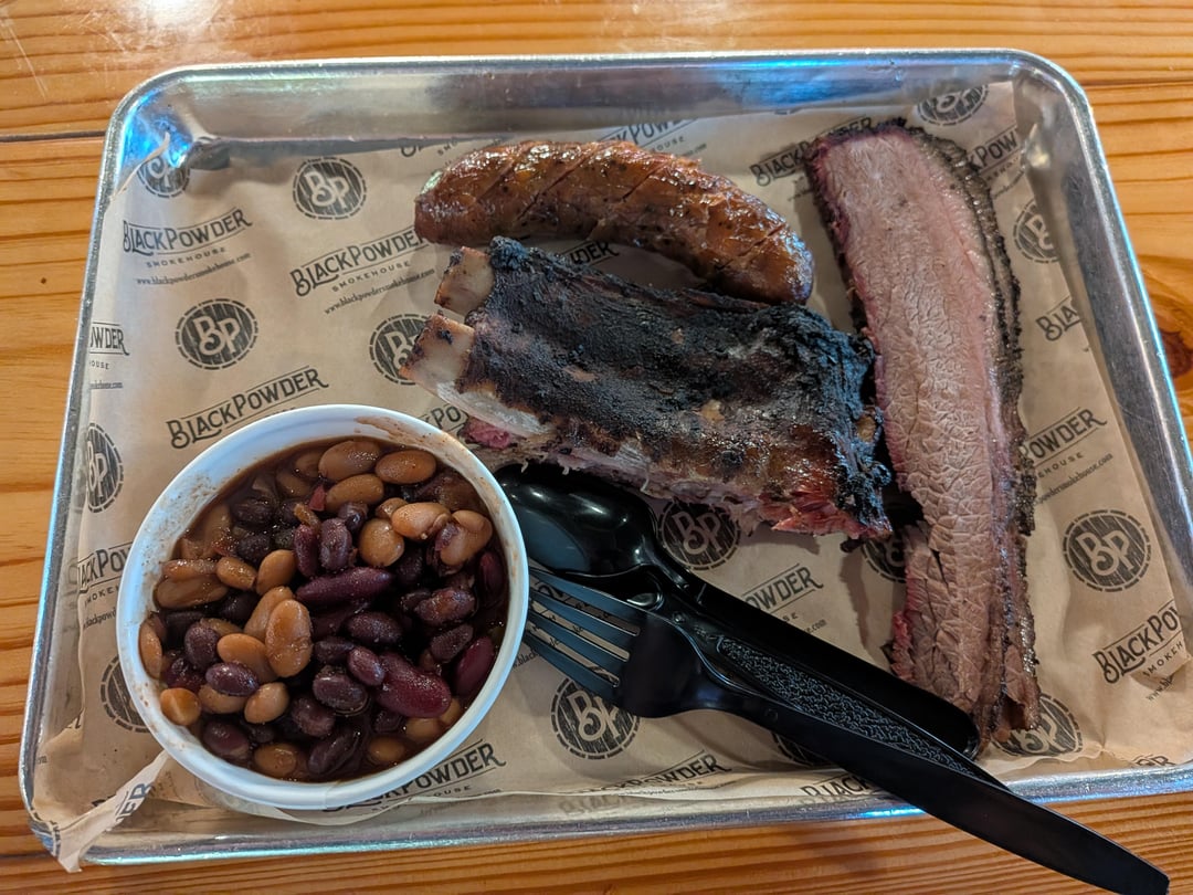 1/4 lb of brisket, 2 ribs, cheddar jalapeno sausage, and beans. Tip included for $25.16.