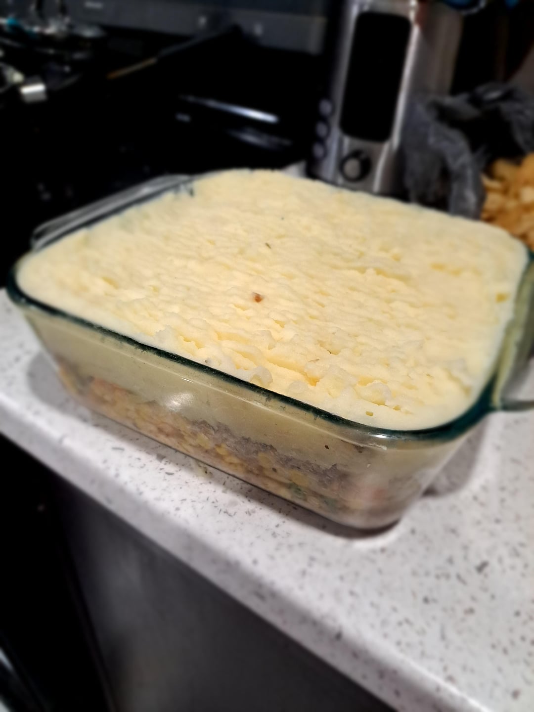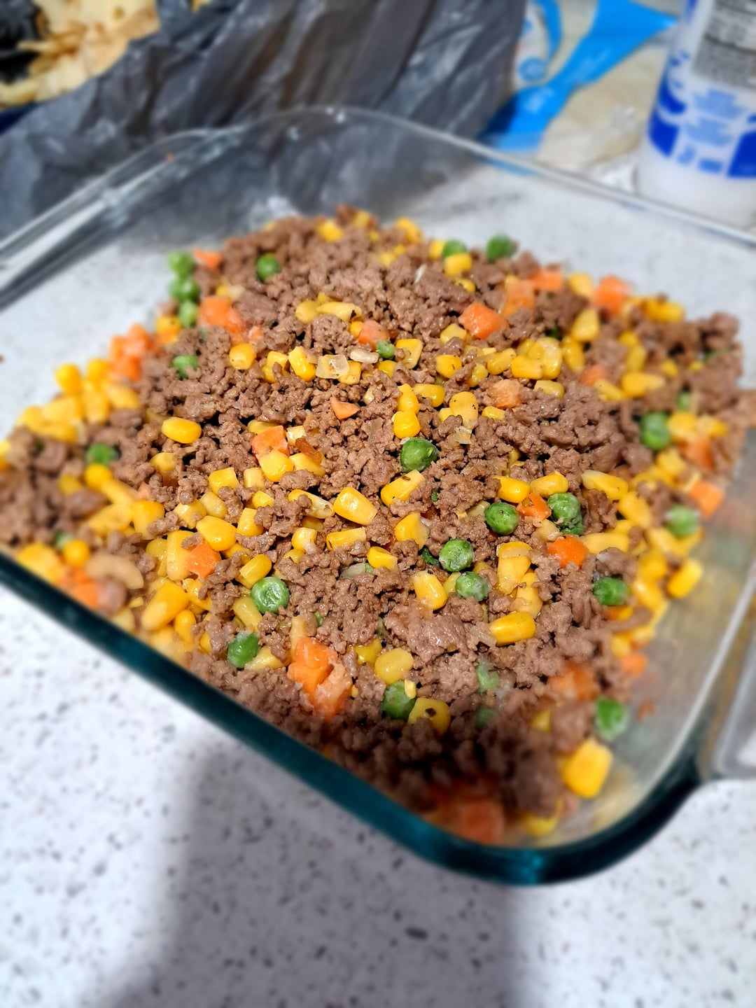 Mix the ground beef with everything but the potatoes, put in bottom of baking dish and spread evenly. Add mashed potatoes on top and spread evenly. Score with fork for texture.