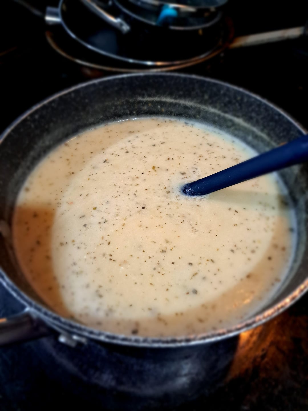 Blend everything but the ham into the broth, heat on medium high and chop or tear up the ham and add it. Make sure it's heat through, taste to check the seasonings and serve.