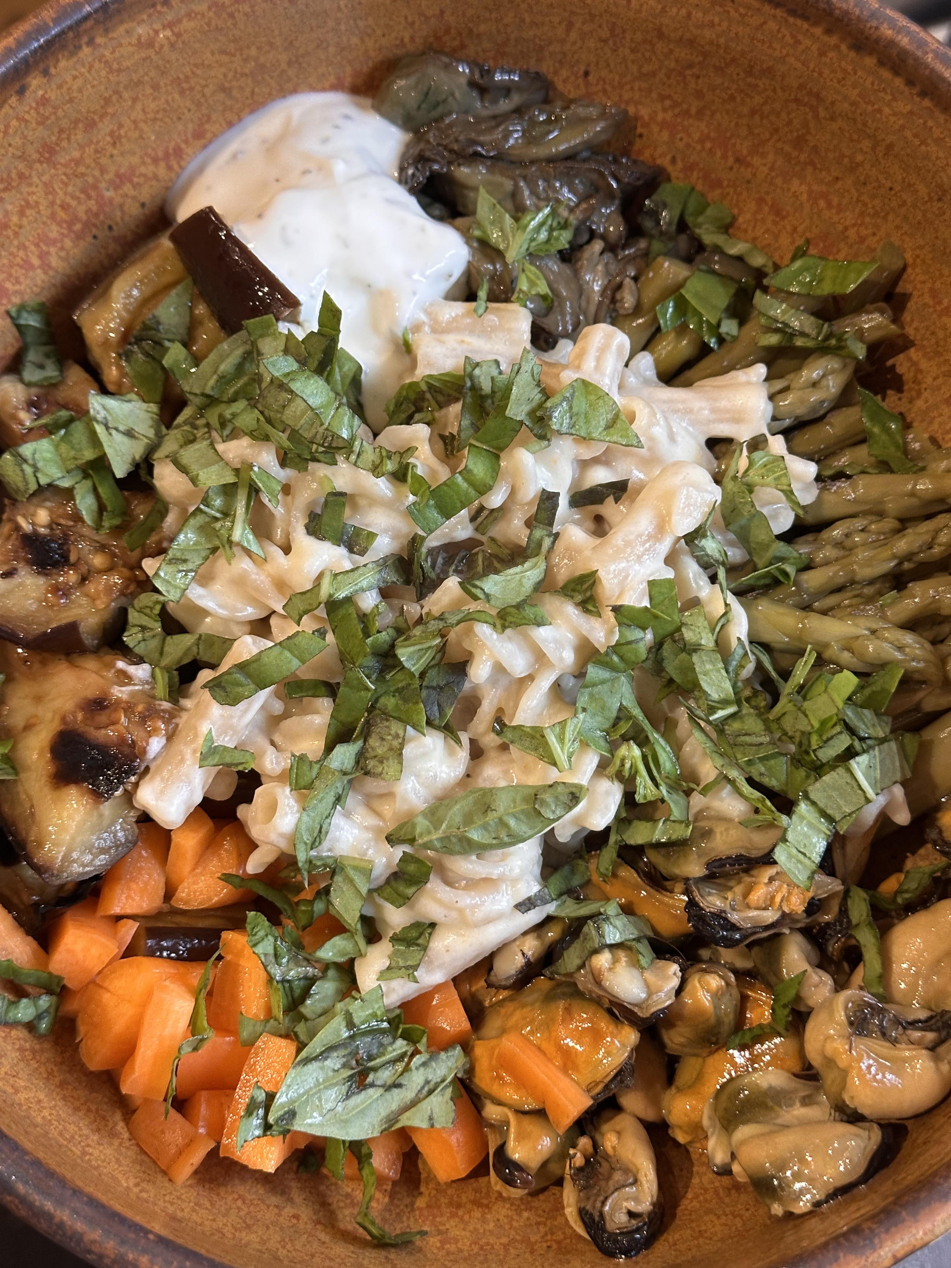 Scrumptious dinner bowl for one, including Patagonia smoked mussels, Crown Prince smoked oysters, pickled carrots, pickled asparagus, roasted eggplant, garlic yogurt, pasta, and fresh basil. So damn good.