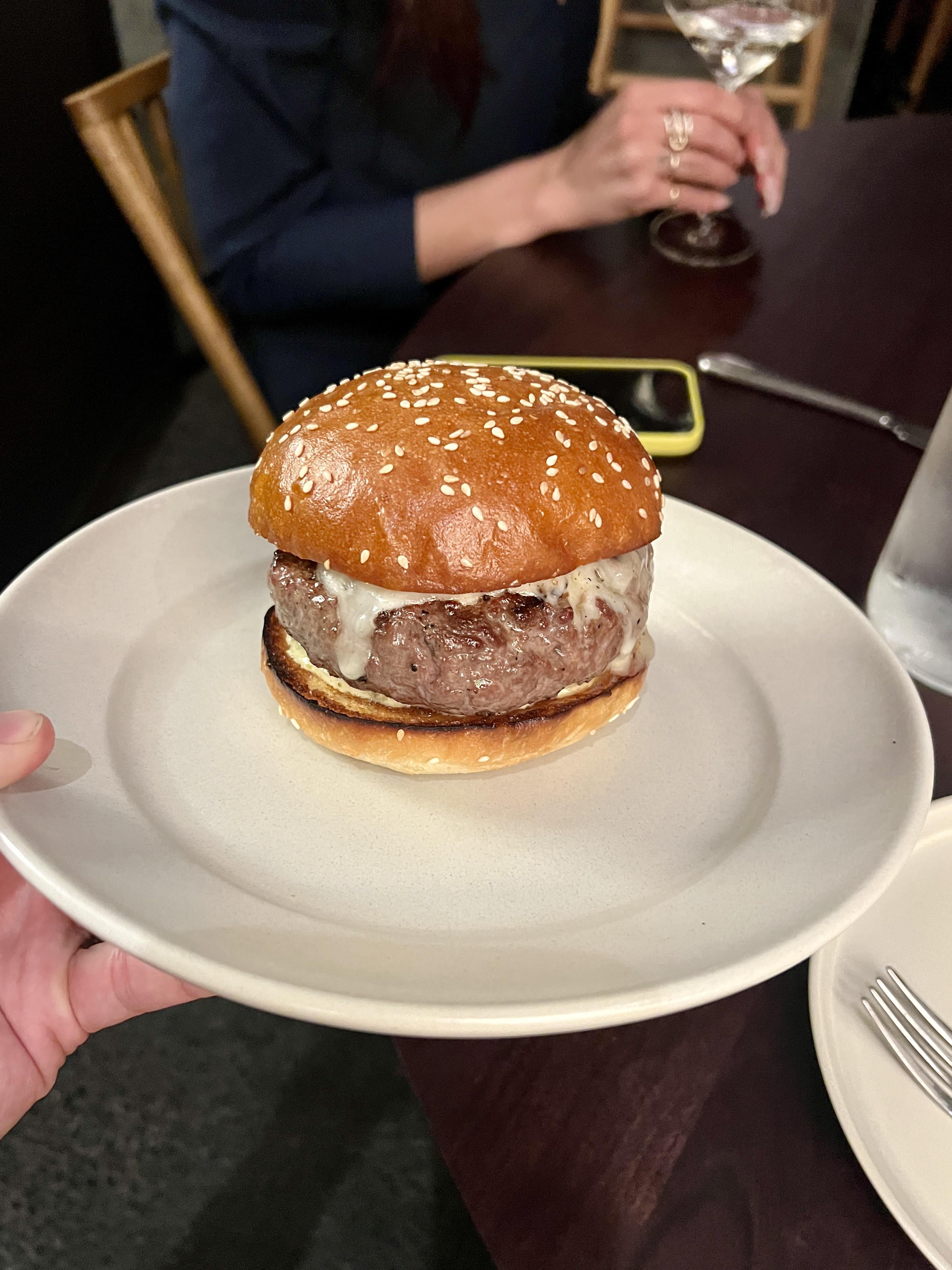 The dry aged thick burger at Darling was the only dish worth mentioning after visiting the newly opened West Hollywood restaurant and listening room. Unfortunately, the service, meal pacing, flavor development, and beverage program were all off. I liked the abalone rice stew, and the artichokes with summer corn were interesting but not fully baked. While the bone in strip was good, the foam pan sauce was inedible. The profiterole was topped with a chocolate sauce that had a mouthwash like aftertaste.
