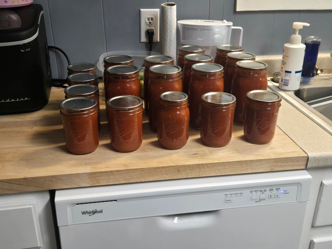 Congrats! I just did tomato sauce yesterday too! I think I got like 16 pints and 6+ half pints from a bushel. I have some pears yet to figure out what to do with, but am otherwise done too!