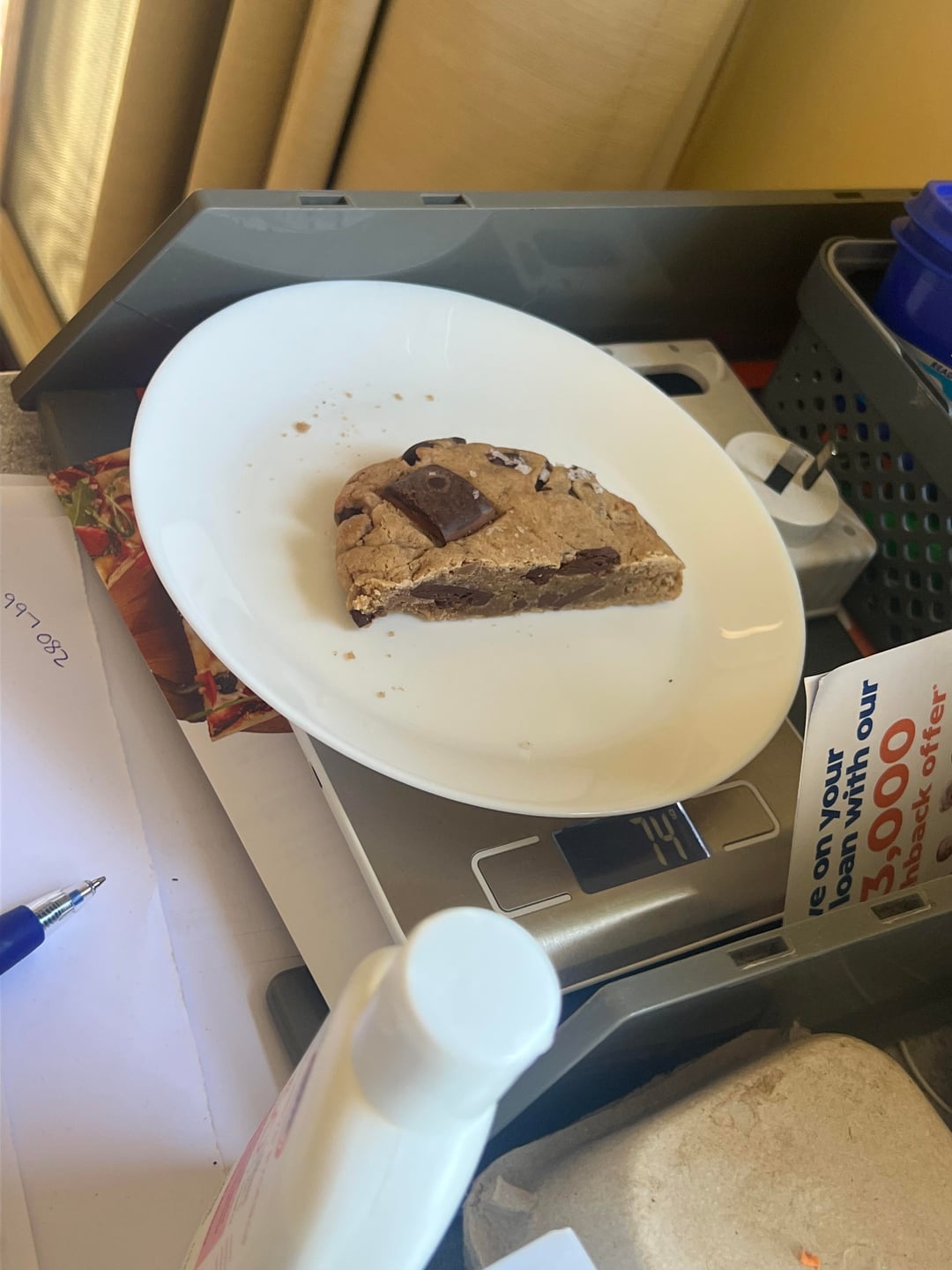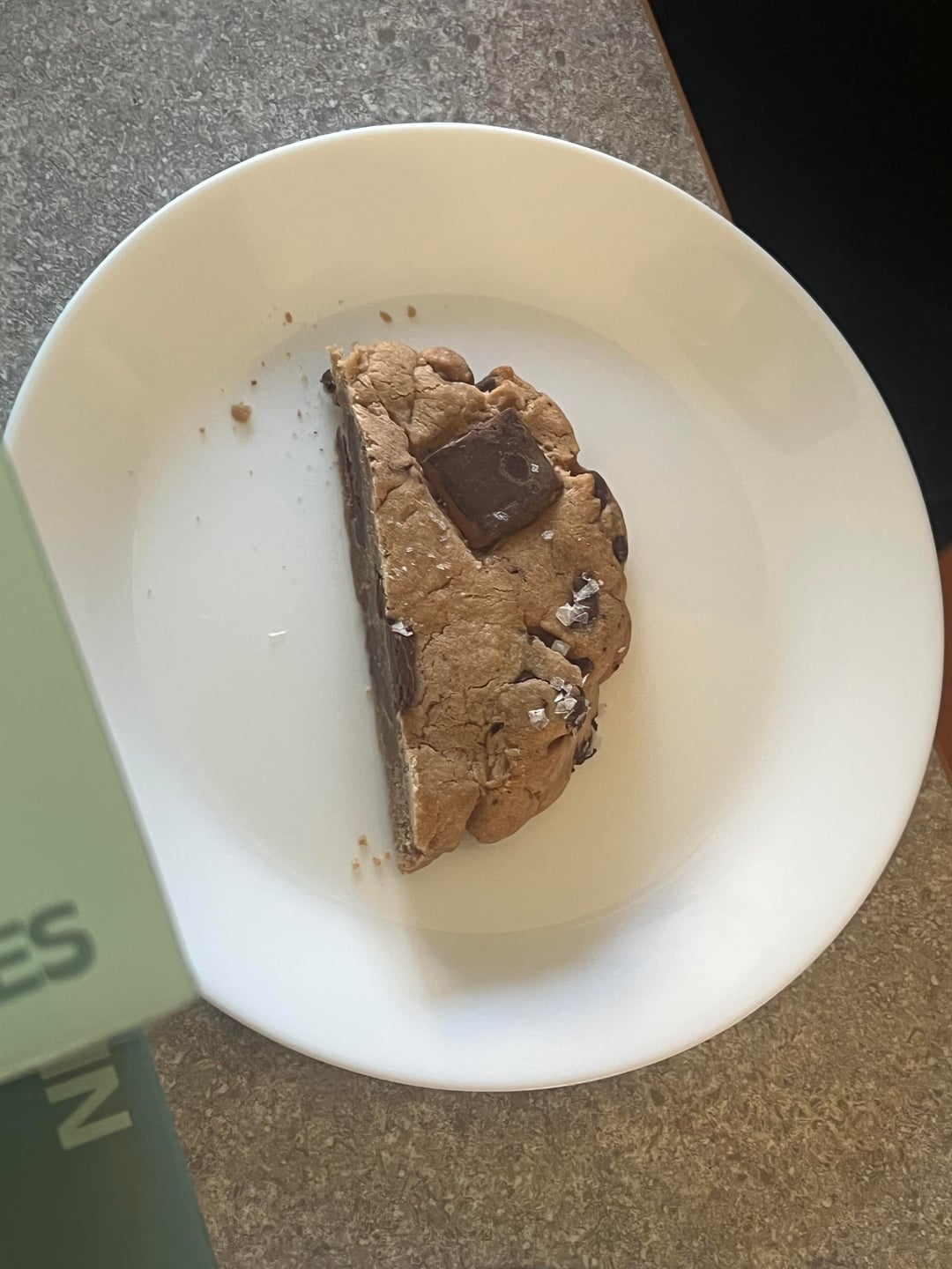 chunky chocolate chip cookie with dark chocolate, milk chocolate, and sea salt (weighed 75g)