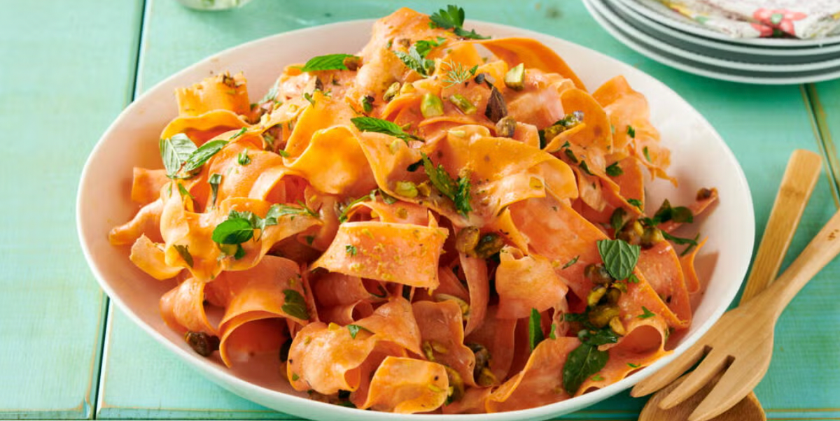 How stunning is this salad? The vibrant dish features thinly sliced carrot ribbons tossed with a creamy lemon-tahini dressing that’s sprinkled with crunchy, salty pistachios. Just garnish it with fresh herbs, then you’re ready to celebrate the season’s best produce!