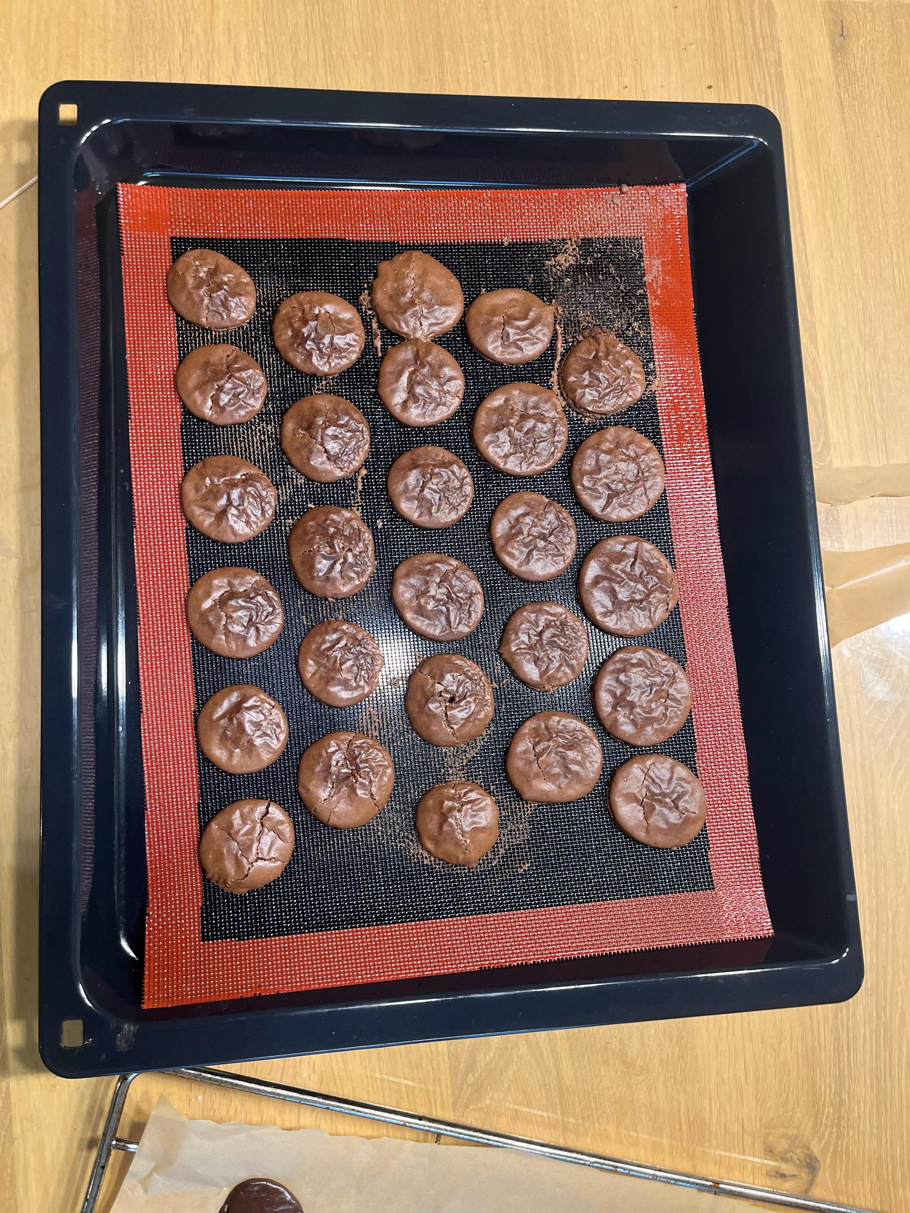 Extra info: ik had de macarons eerst met 3 bakplaten in de oven gezet voor 20 minuten op 150 graden. Hierna waren de bovenste gelukt, maar die eronder niet. Zelfs na nog 10 minuten extra in de oven zien de macarons er nog steeds zo uit. Enige tips?