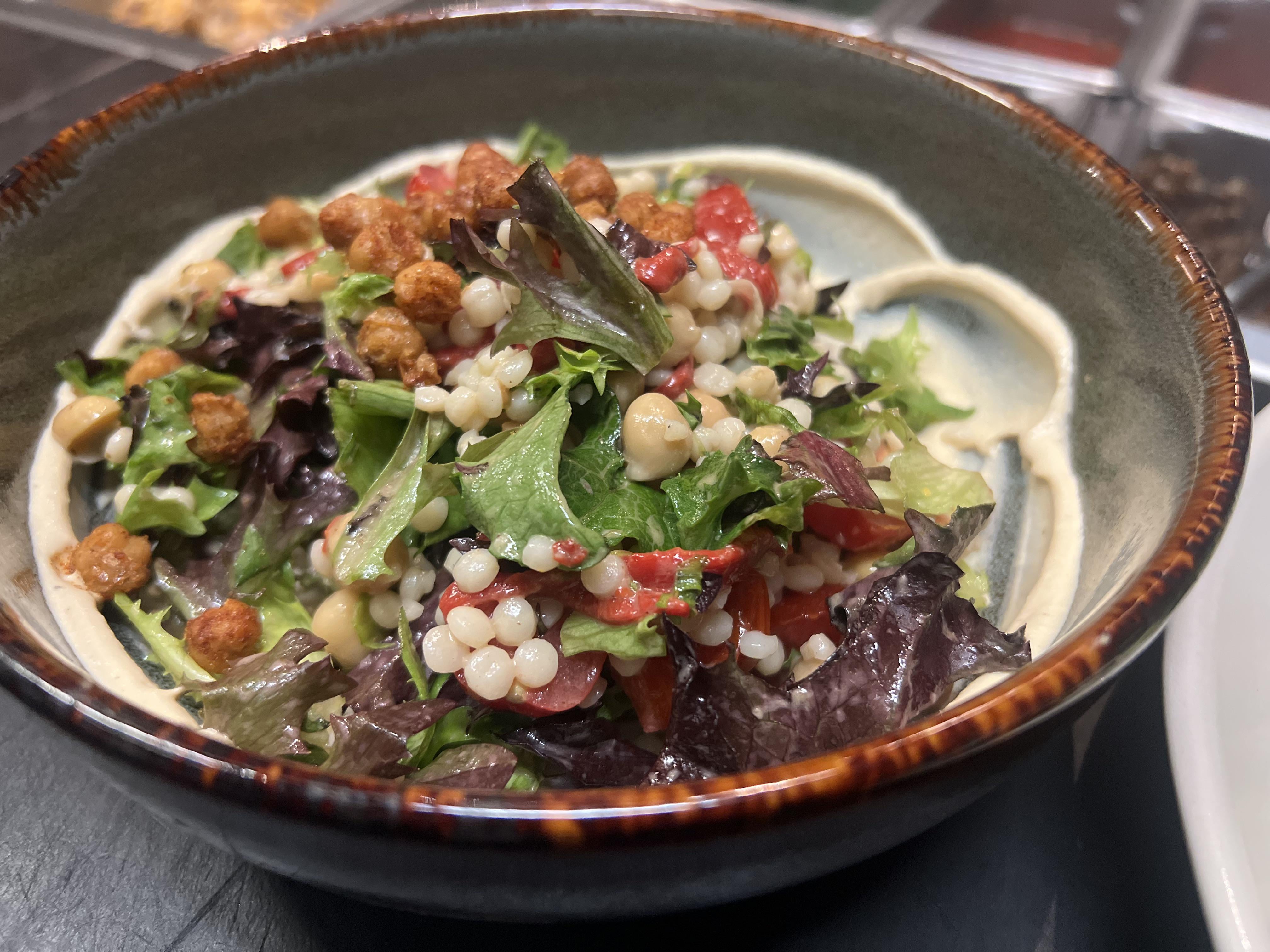 Cous cous with a bed of spring mix, piquant peppers, sun dried tomatoes and chickpea (some fried, some soaked) on a flower of hummus