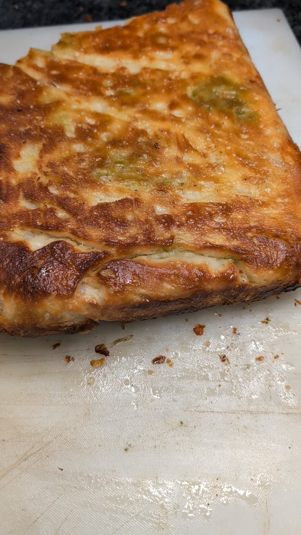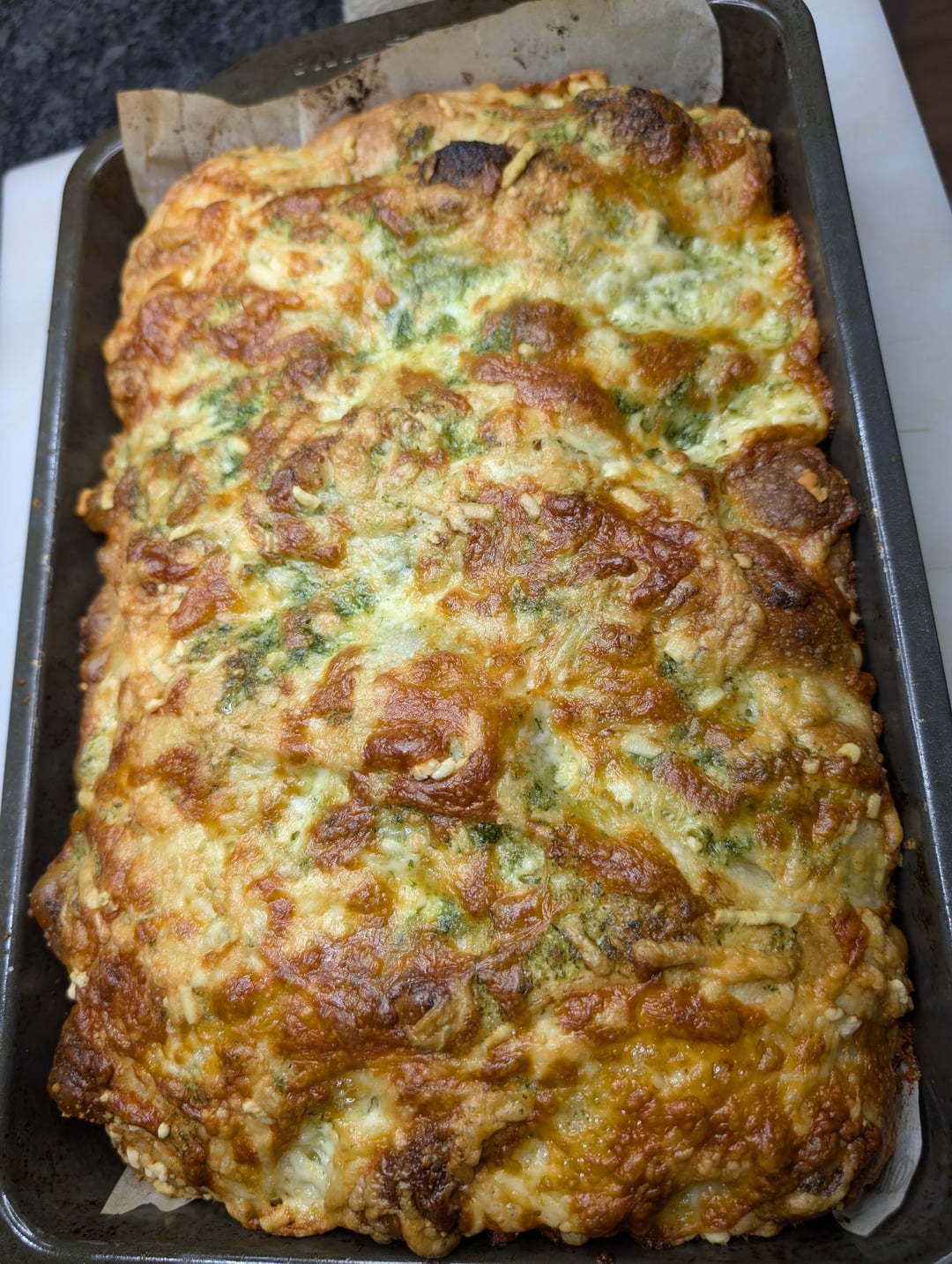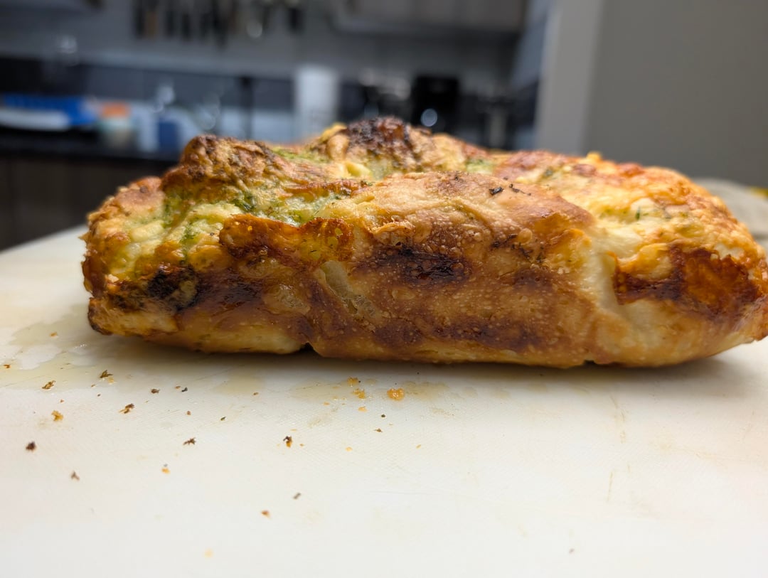 For the garlic, herb, and cheese part I put softened butter, parsley, garlic, parmesan, some evoo, garlic powder, onion powder, a few shallots, salt and pepper in a food processor. I put half on the dough about 1hr through the 2hr counter proof and folded the dough into itself, then before baking spread the rest on top and added gouda, fresh parmesan, and monteray jack.