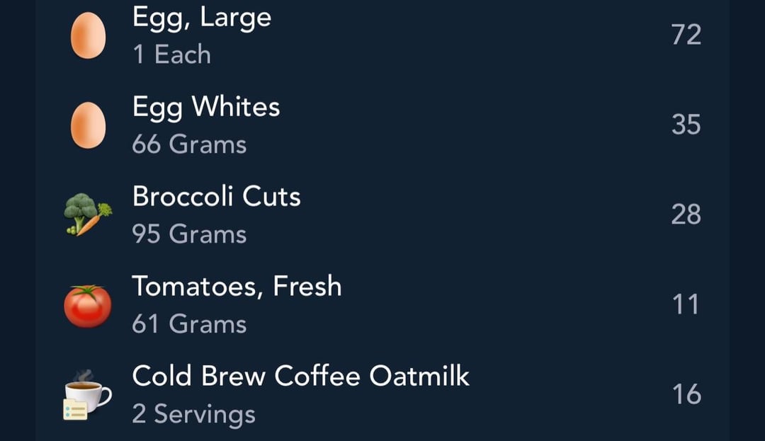 • 1 egg + 66g egg whites + 95g broccoli + 1/2 tomato = 146 calories