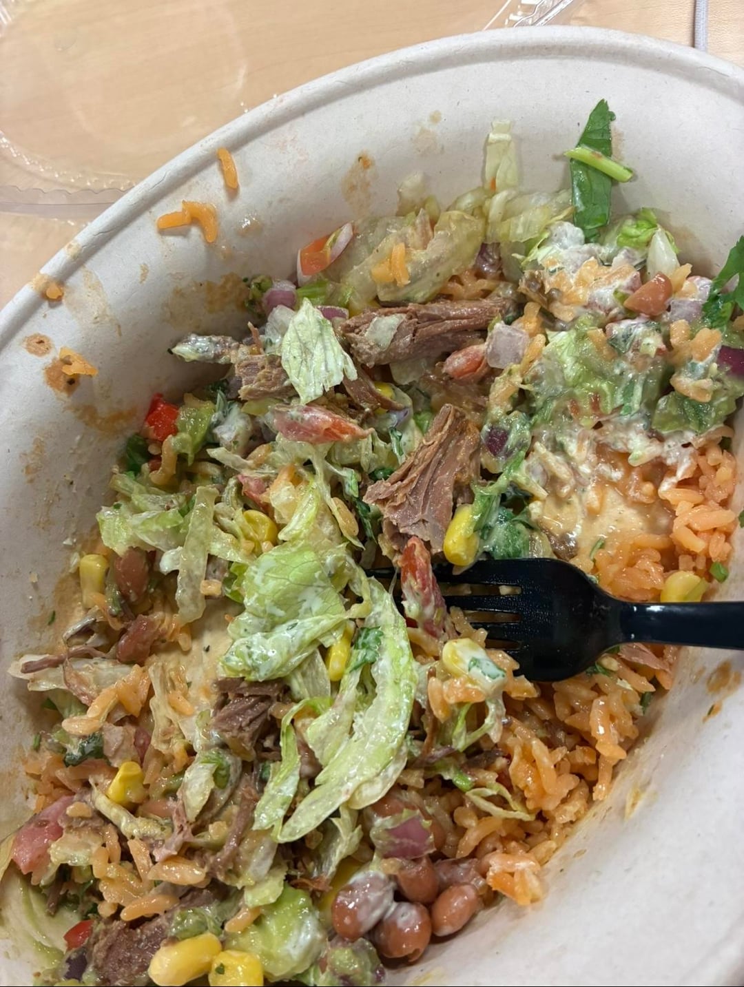 I kinda ate the bowl a bit so it was fuller than this but I got barbacoa, Mexican rice, pinto beans, pico de gallo, guacamole, lettuce, and creamy cilantro sauce. I bought both from the Tortilla Street Food truck.by SecureTheBagandDip Dining and Cooking