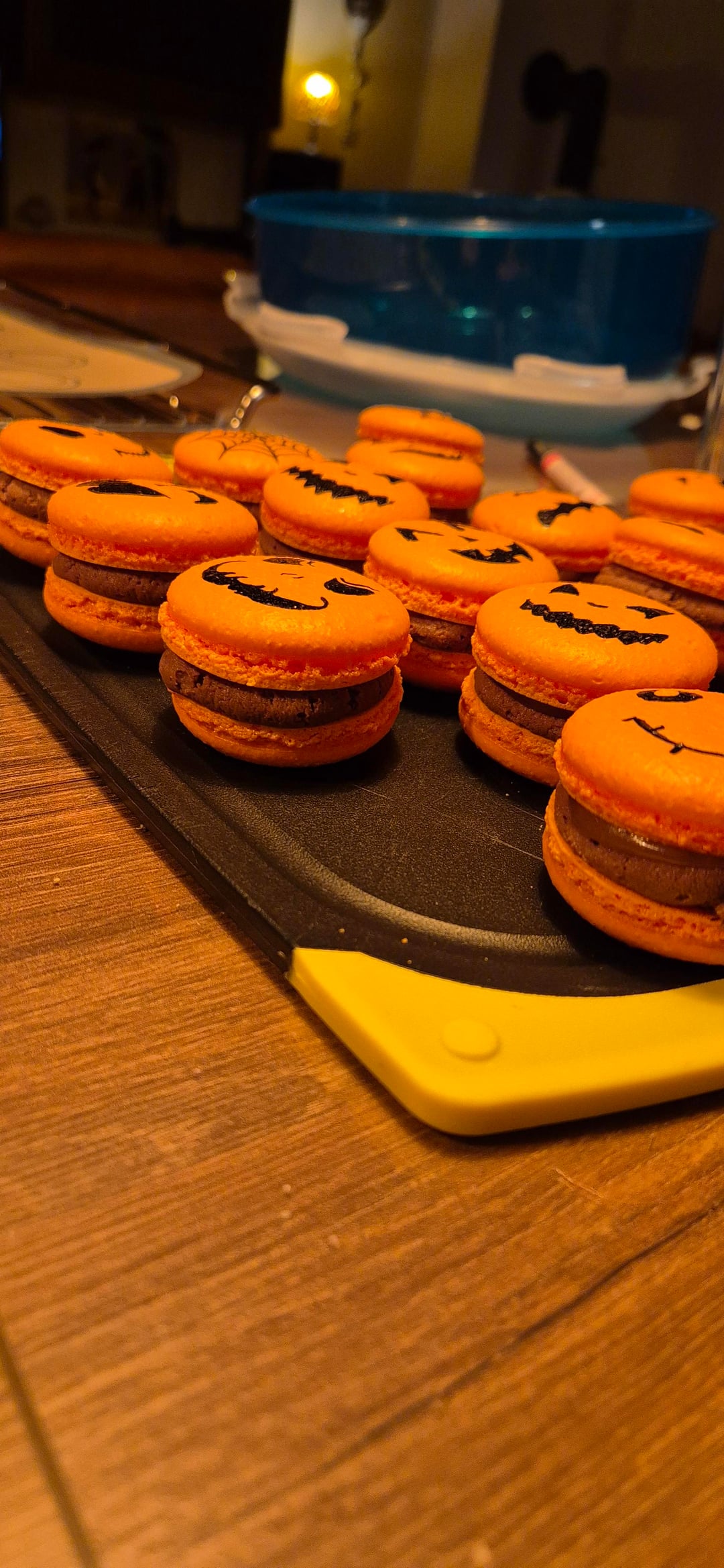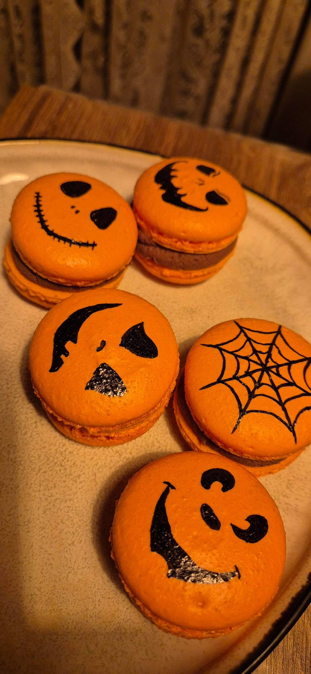 Spooky Macarons with whipped chocolate ganache and a soft caramel core