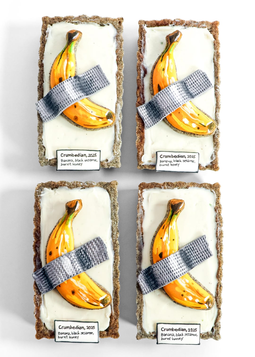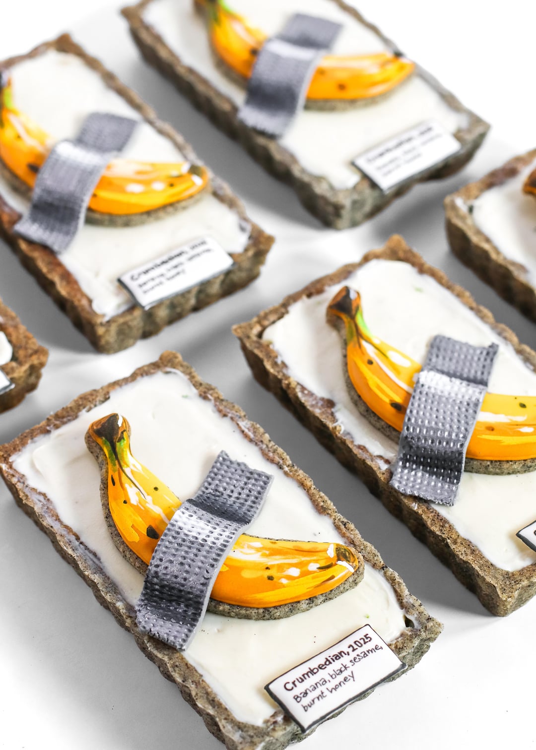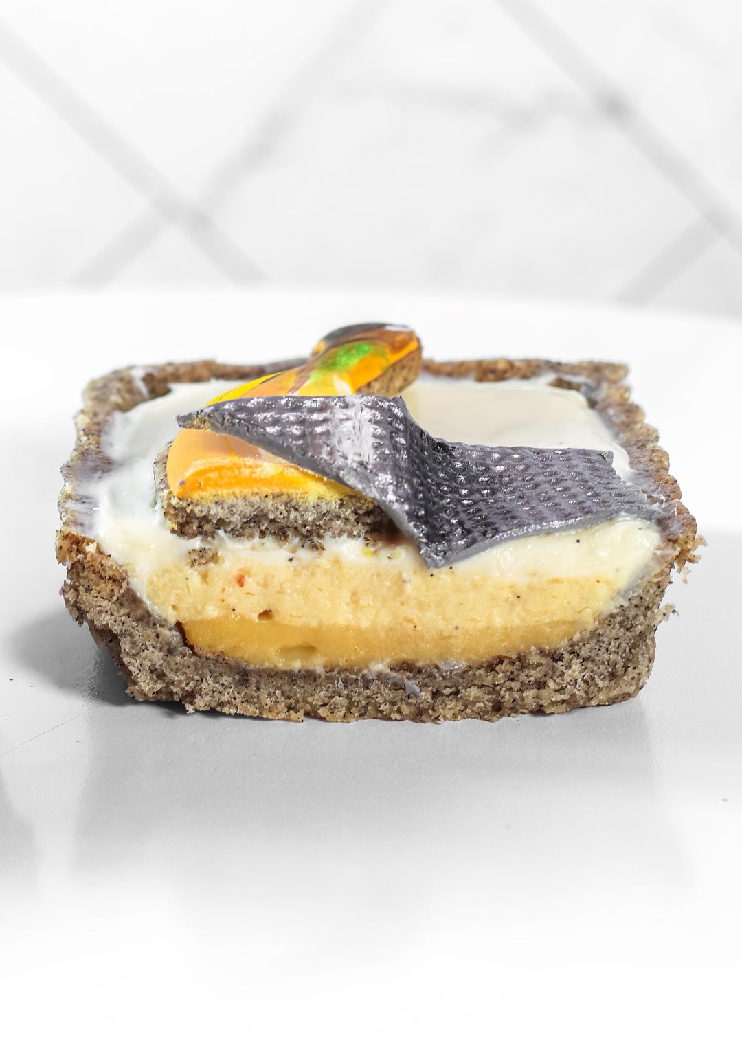 These tartlets have black sesame cookie crusts, and are filled with: burnt honey custard, caramelized banana ganache, and cream cheese/mascarpone frosting. I’ve shared most of the recipes and a tutorial here: