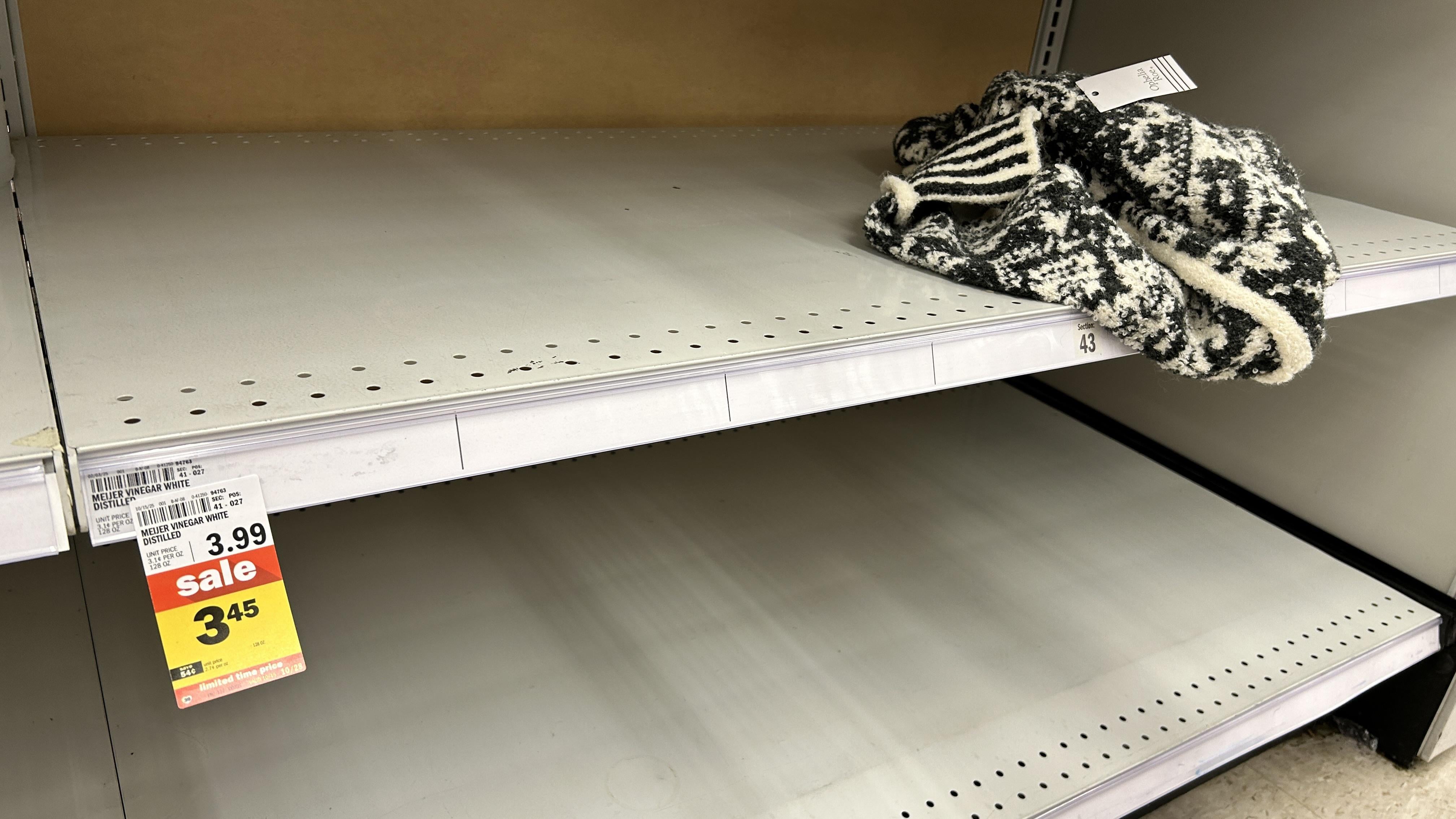 My photo shows two standard beige grocery store shelves, starkly empty save for a random pair of crumpled black and white shorts oddly tossed onto the right side of one shelf by another irritable shopper. A yellow and reg tag on the far left declares that gallon jugs of generic Meijer-brand white distilled vinegar (normally priced at $3.99) are on sale for $3.45.