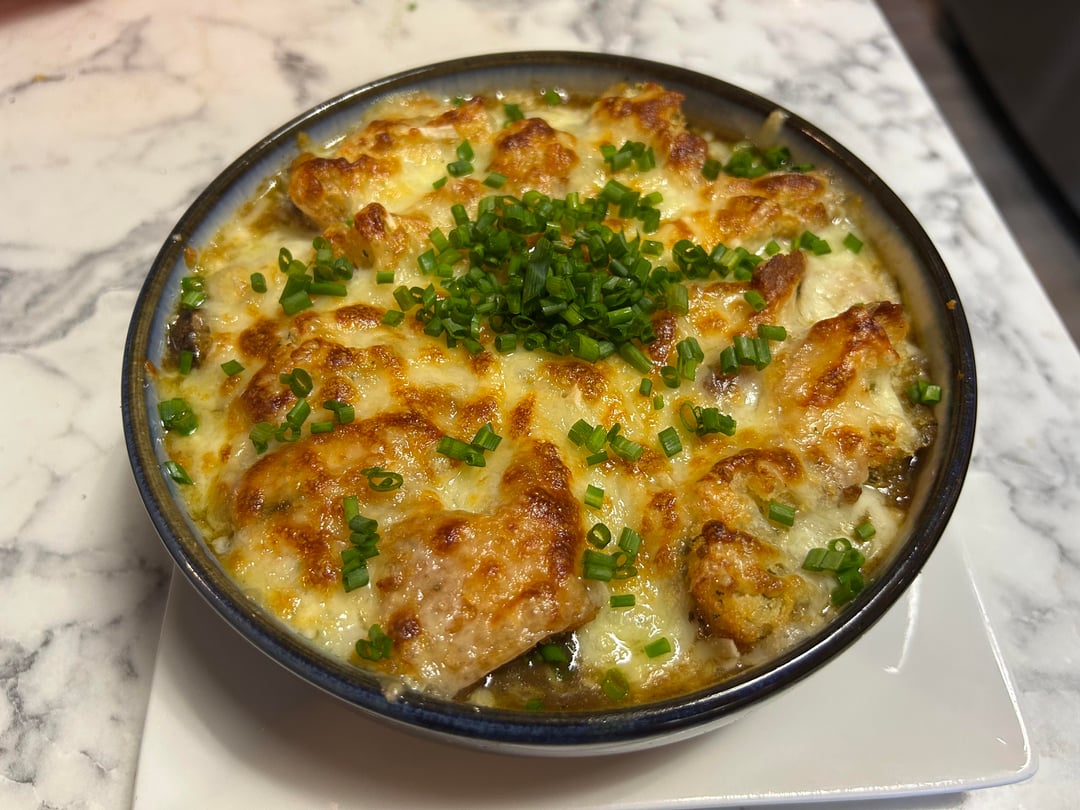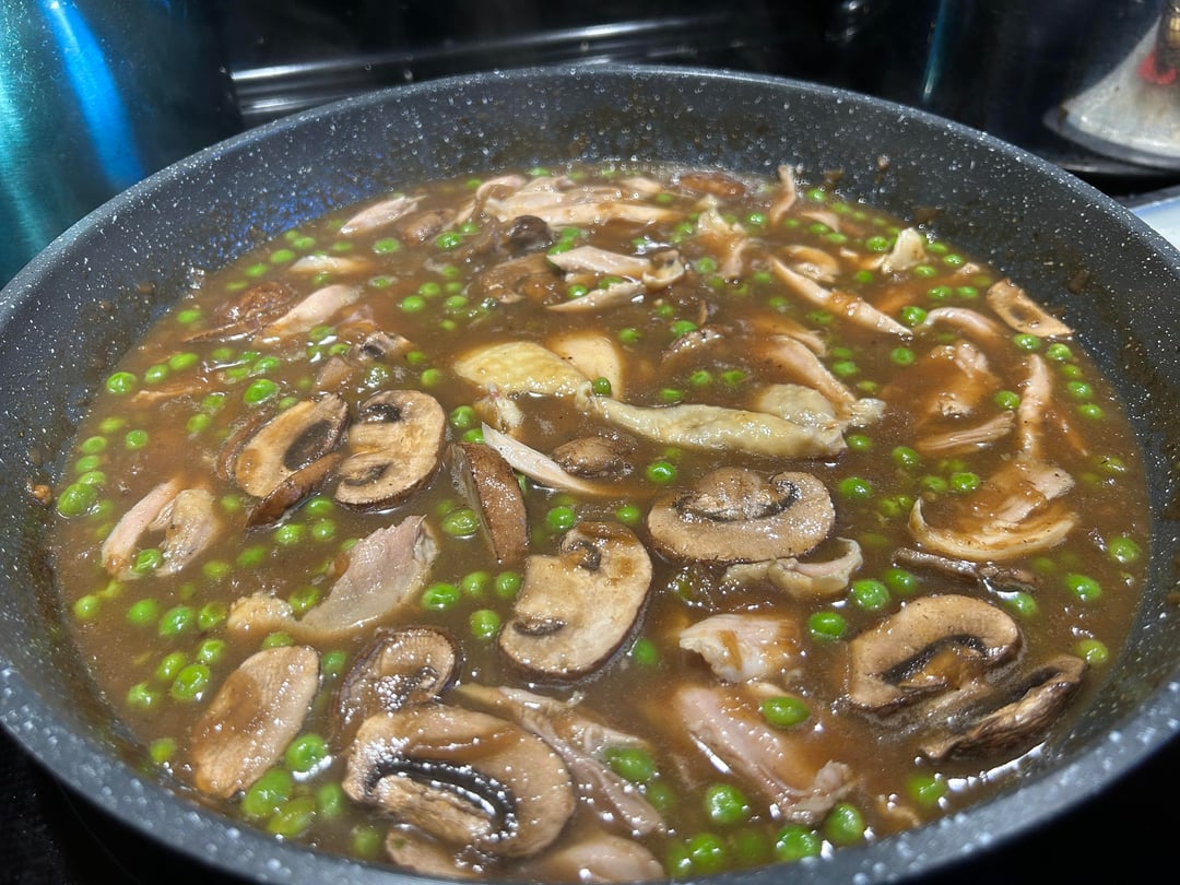SV seasoned legs, 167F x2hrs. Homemade French onion soup (or store bought if you are lazy and don’t enjoy flavor). Add the cooked chicken collagen & juice to the soup and reduce. Add sliced roasted baby portobello mushrooms and fresh or “steam-fresh” frozen peas.
