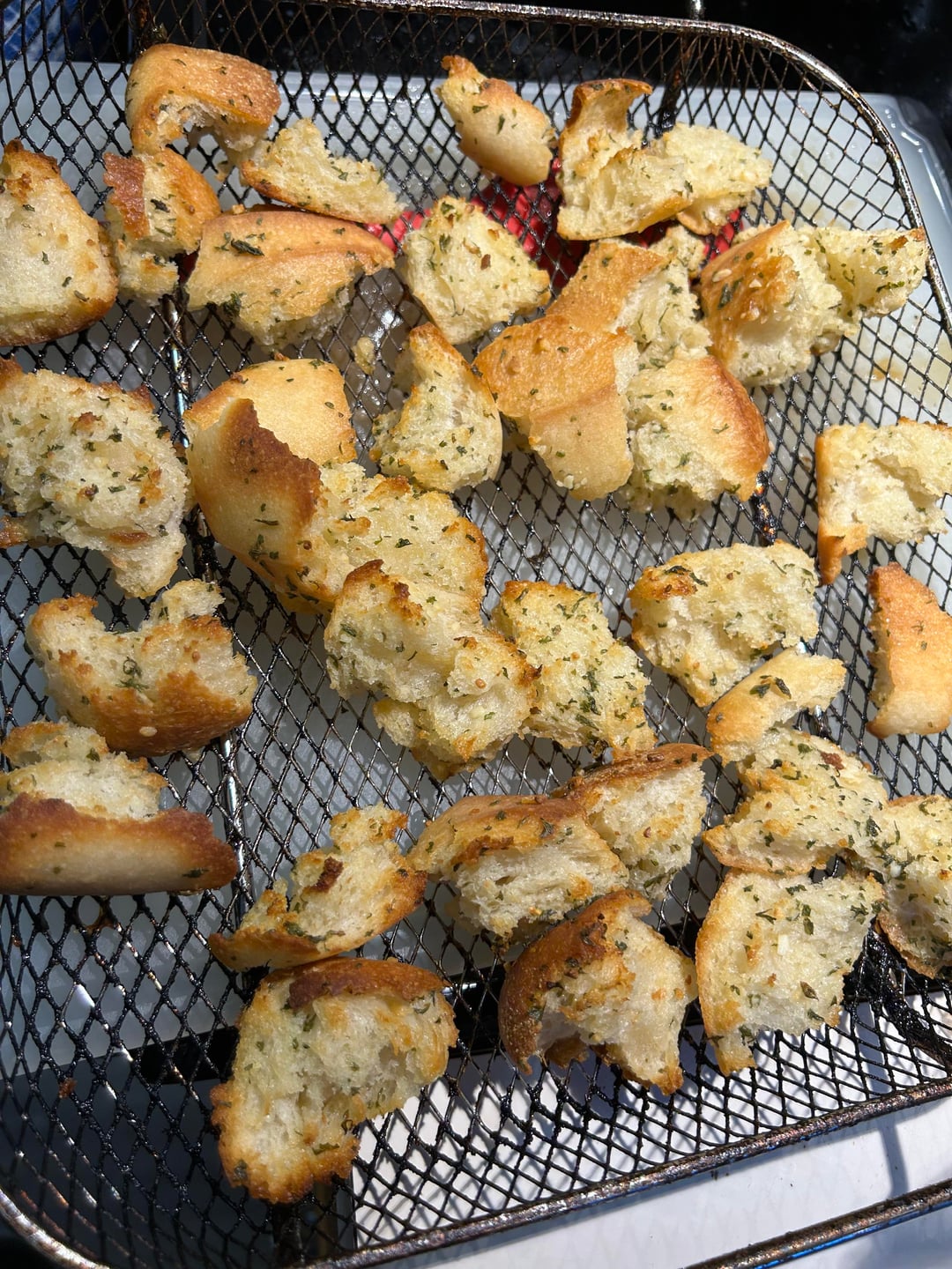 Rip a baguette into bite-sized chunks. Toss in melted salted garlic butter w/EVO and toast them until golden brown.