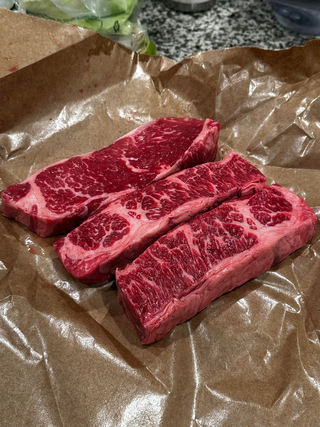 Steaks were NY strip (left) and denver steak (right) from a local butcher. I marinated them about 30 minutes before cooking on the cast iron at the highest heat on my gas stove with beef tallow. Flipping until I got the crust desired stopping at ~100 deg, then finished in oven at ~500 degrees until ~125.