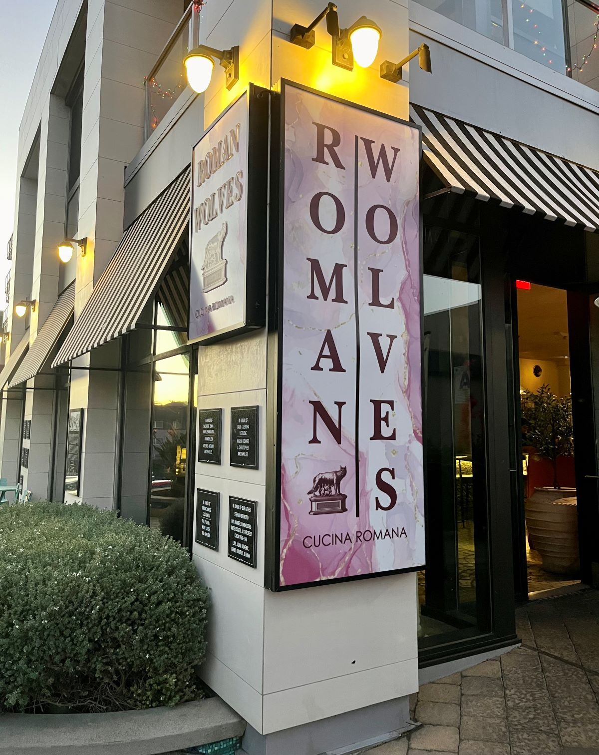 Roman Wolves resides in the triple-storefront space previously occupied by the vegan restaurant, Cafe Gratitude. It is appointed in Roman-themed décor such as columns, frescos and patterned floor tiles while managing to escape the kitschiness one might expect.