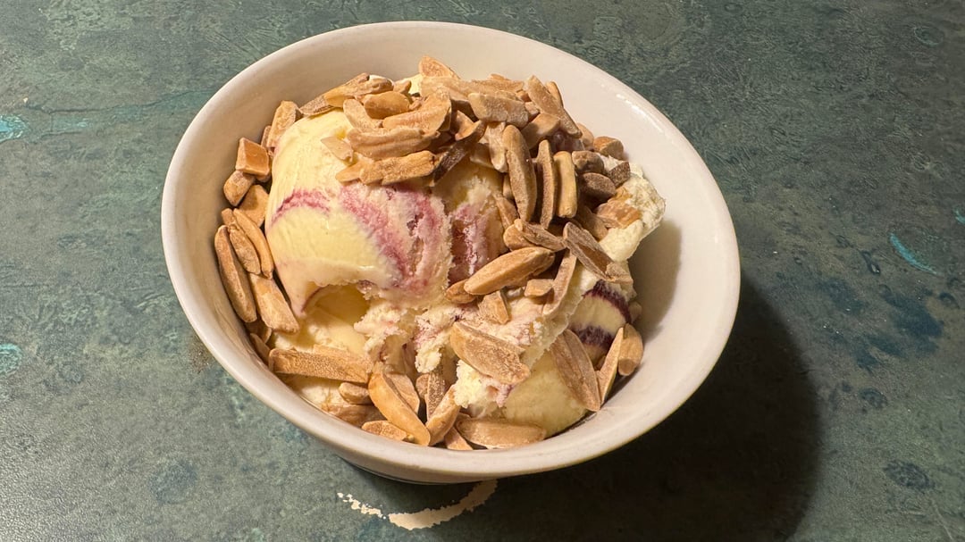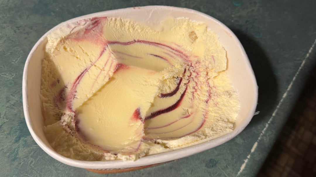 Really great flavor, from a brand that never lets me down. Mild almond base tastes like very rich vanilla, the blackberry swirl is delicious, and the cookie dough has an excellent texture and flavor. And there’s just enough of both the blackberry and cookie dough.