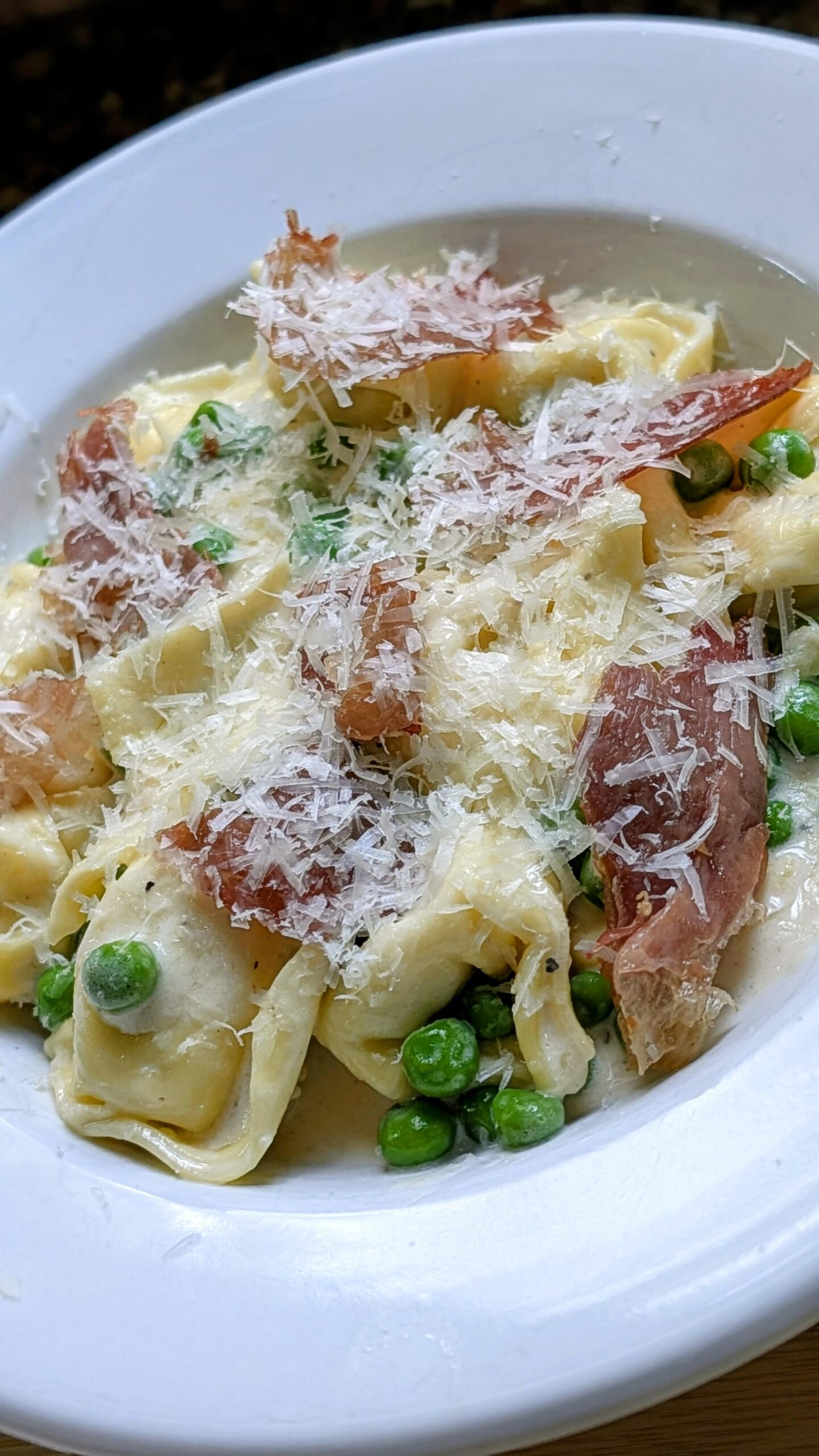 with Peas & ParmesanMods: I used some Parmigiano-Reggiano. I had in the fridge for the sauce, and used the supplied parm for the topping.Chefs Note: I feel this dish would be better if pancetta was used instead of prosciutto. by Sevraz Dining and Cooking