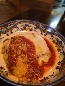 On our last visit, we started with salads and bread. I ordered the baked ziti and my wife chose the seafood pasta. I am a ziti fan — it’s always fun and easy to eat as well as being a very nice conduit for sauce delivery. Their seafood dish is my wife’s favorite. It’s an ample serving of shrimp, scallops, and clams with a garlic-butter sauce that she really loves. All was filling and wonderful.
