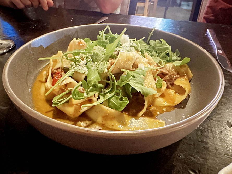 Mimo uses Carpano Antica vermouth, the Cappelletti Amaro and prosecco in this drink. We also ordered a bottle of red wine for the table: a 2021 Francesco Cirelli Montepulciano d’Abruzzo, which was good and improved throughout the evening as it opened up.