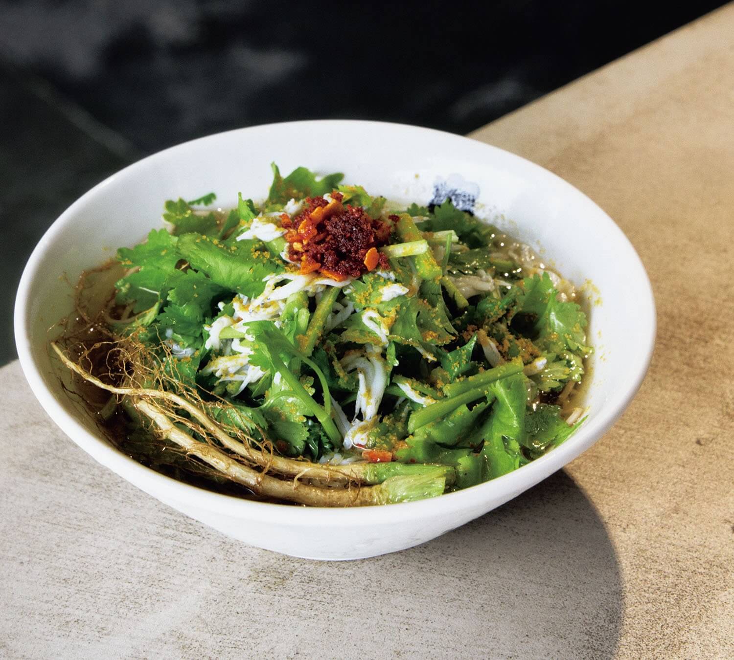 Summer’s standout dish, ‘Yamamori Pakuchi Shirasu to Karasumi’ (¥1,540). Coriander is served whole, its roots lightly fried, topped with a hint of ‘ra-yu’ chili oil.