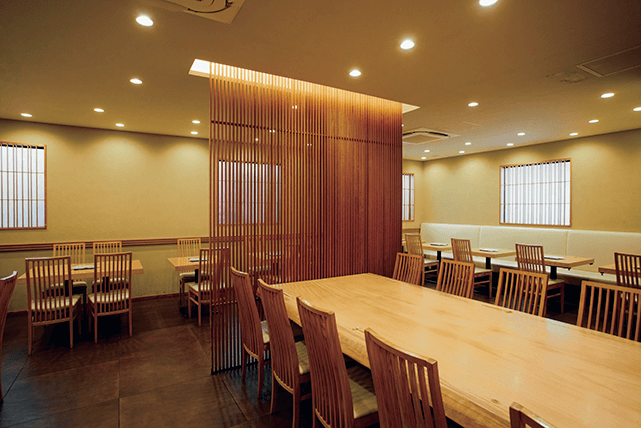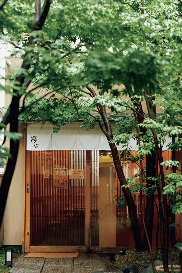 A chic, contemporary Japanese interior with lattice details and refined finishes. In the evening, premium skewers and sake precede a final bowl of ‘udon’.