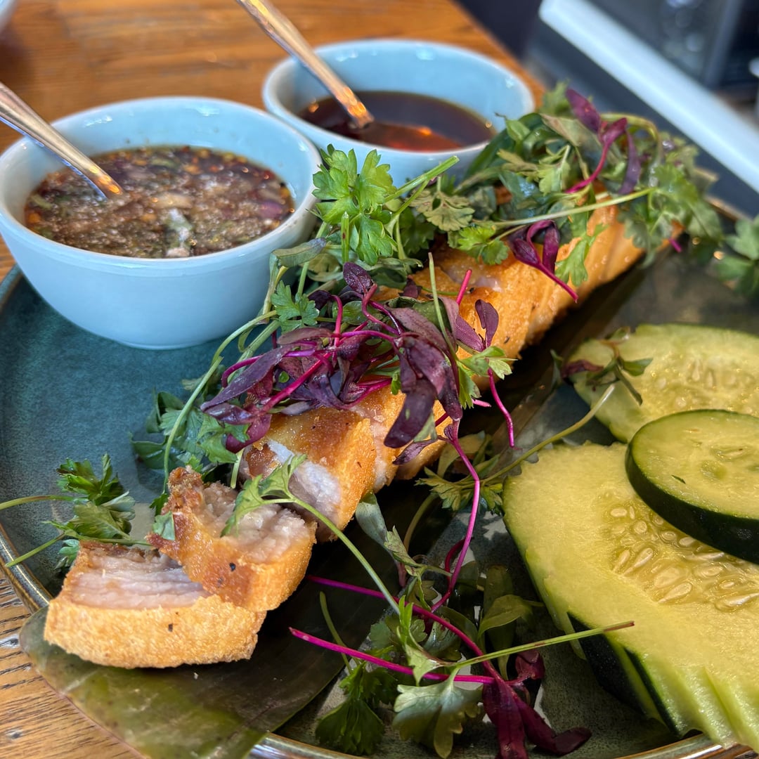 - Crispy pork belly. This appetizer offers a thin strip of pork belly that's been roasted until the skin crackles and then comes with two dipping sauces. One is sticky/sweet, the other more like a prik nam pla. I'm not sure the microgreens do much besides serving as garnish but the pork belly was crispy, not dry, and worked well with both sauces. I would have preferred slightly larger bites but this wasn't annoyingly small or anything. 7.5/10