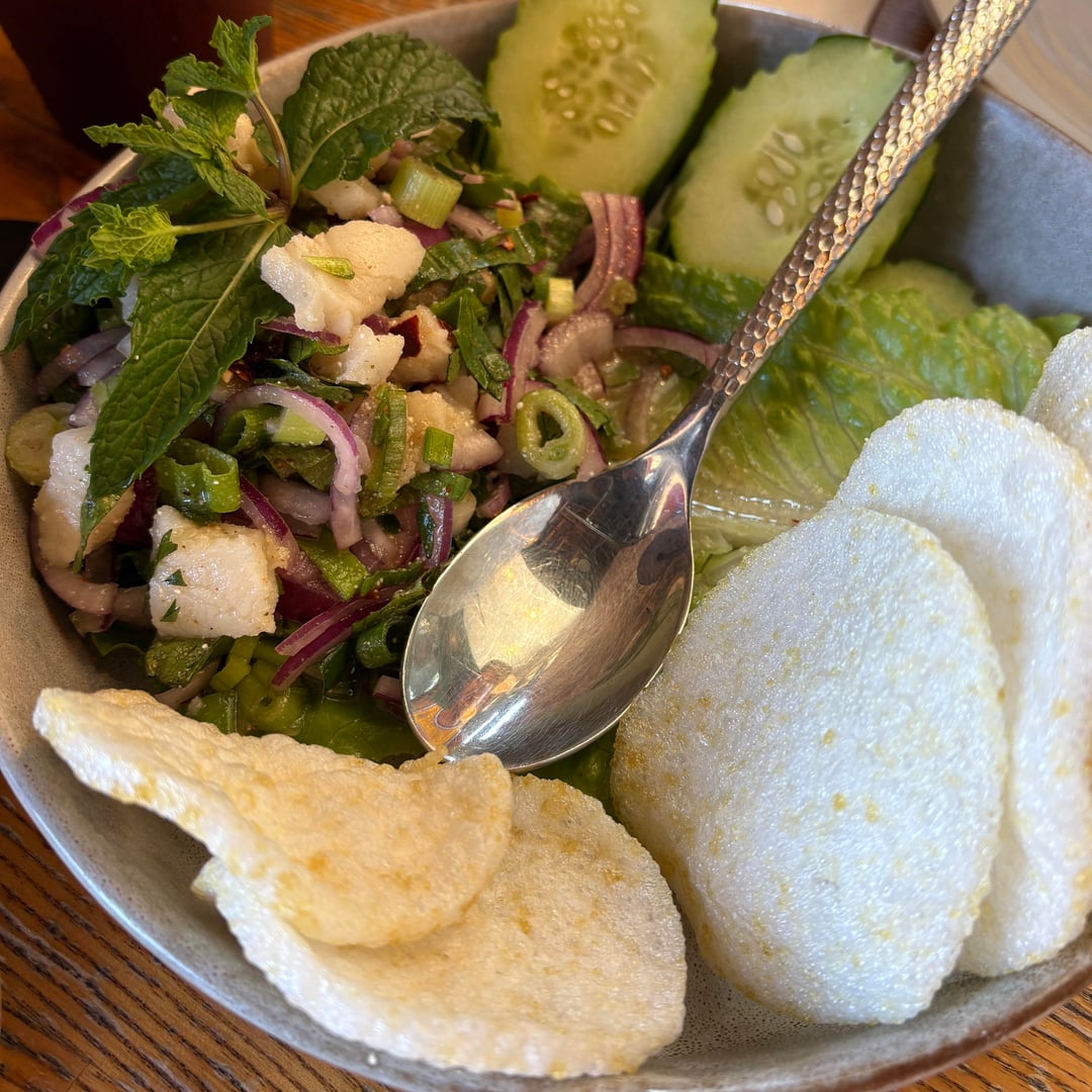 - Sea bass larb. Basically larb-meets-ceviche. In concept, it makes sense since both use a lot of acidity as their base flavor. In execution: I was rather underwhelmed by it. Part of the issue for me was the portion size. With larb I've had elsewhere, you don't feel like you have carefully portion each bite out but here, as you can see, their serving size is small enough where I didn't feel like I could just dig in. Instead, since we were sharing it, my friend and I had to focus on not taking too much per serving. Also, I'm just not a fan of shrimp chips and would have enjoyed this more if they went with conventional lettuce cups. 5/10