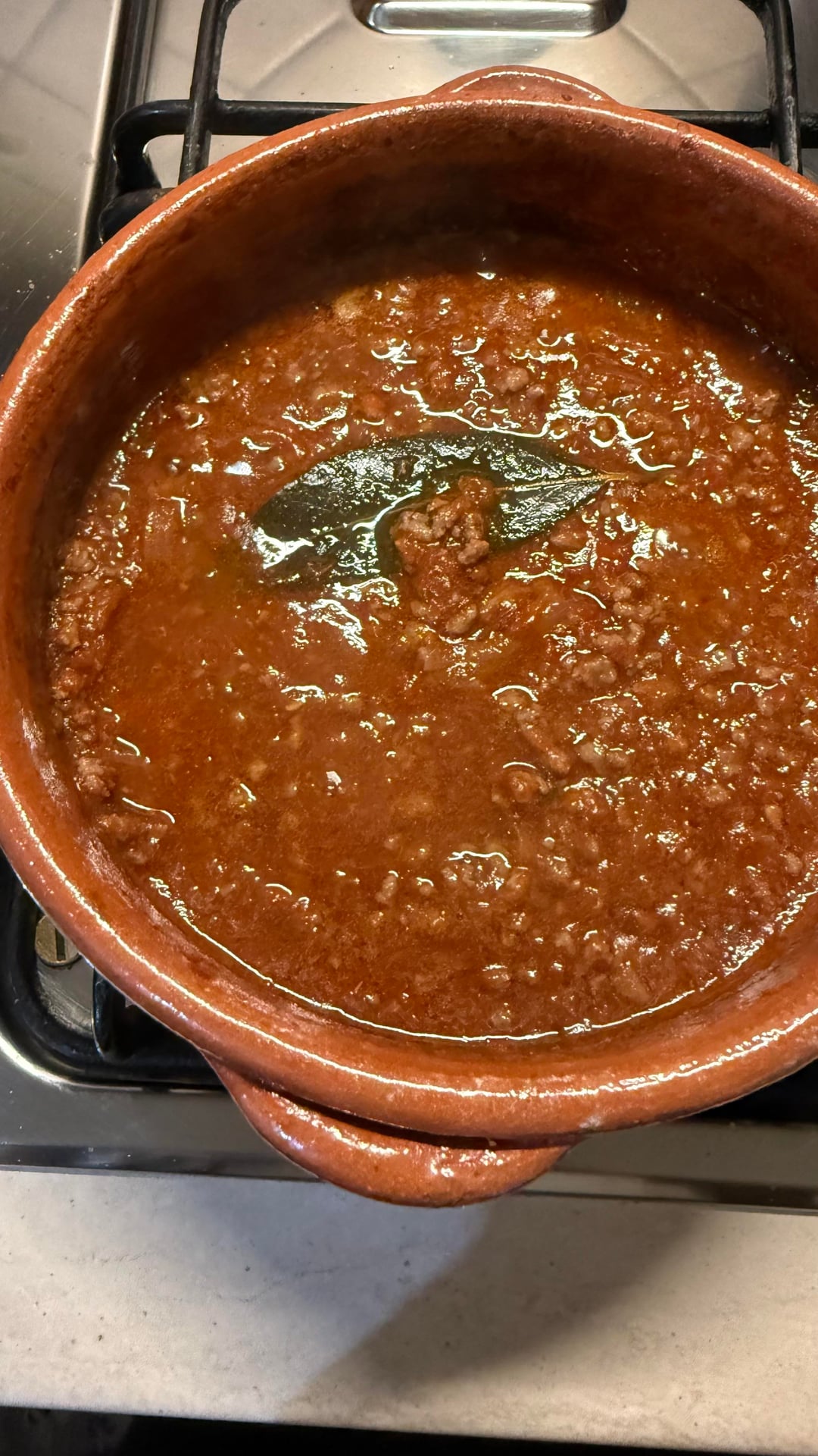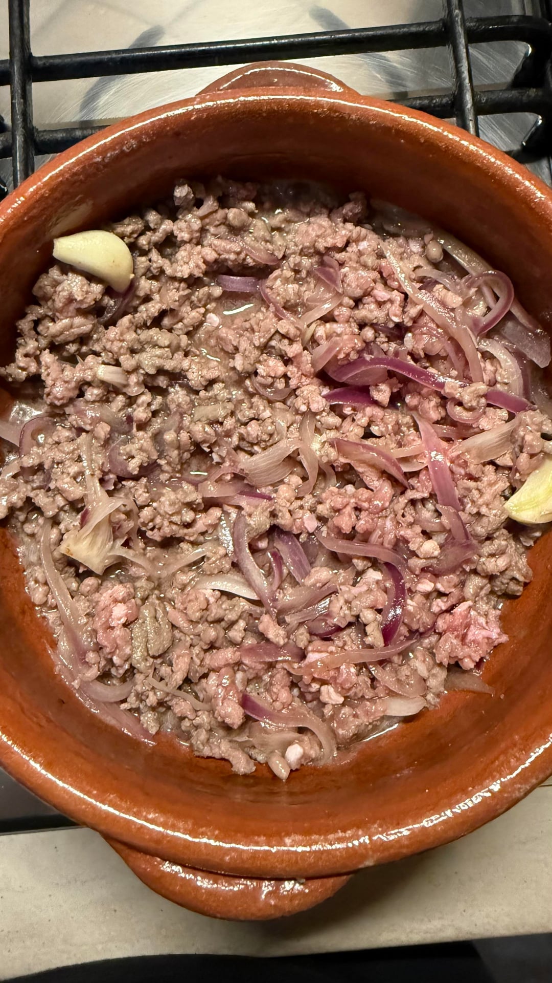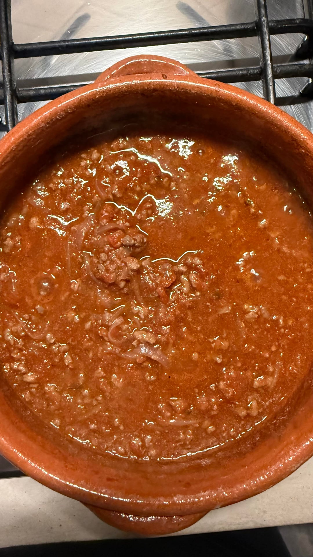 Cut the onion into strips and fry it with garlic. As soon as the onion has softened, add the minced meat and as soon as the water in the meat has evaporated, deglaze with red wine. When the alcohol evaporates, add tomato puree and cook over low heat for an hour