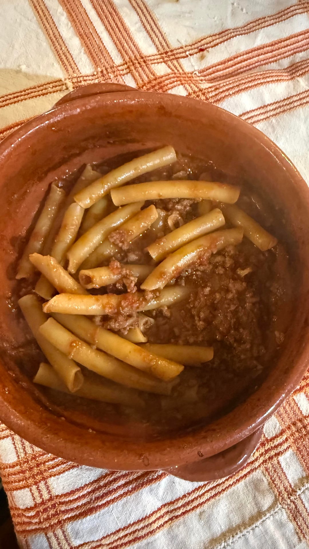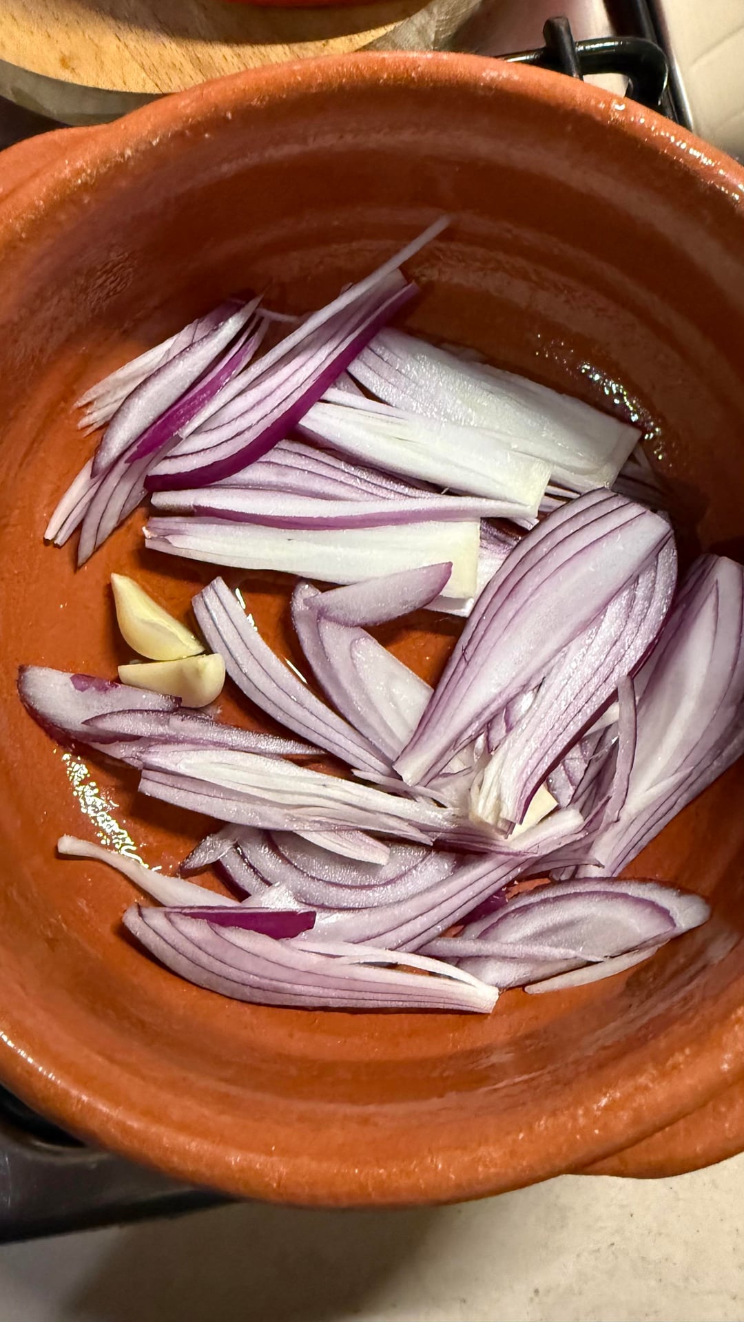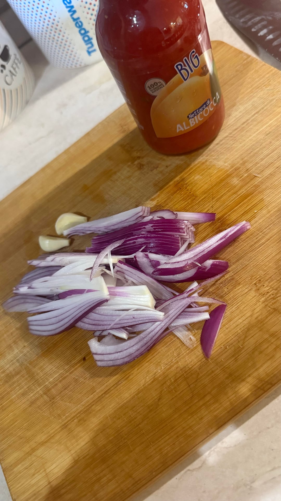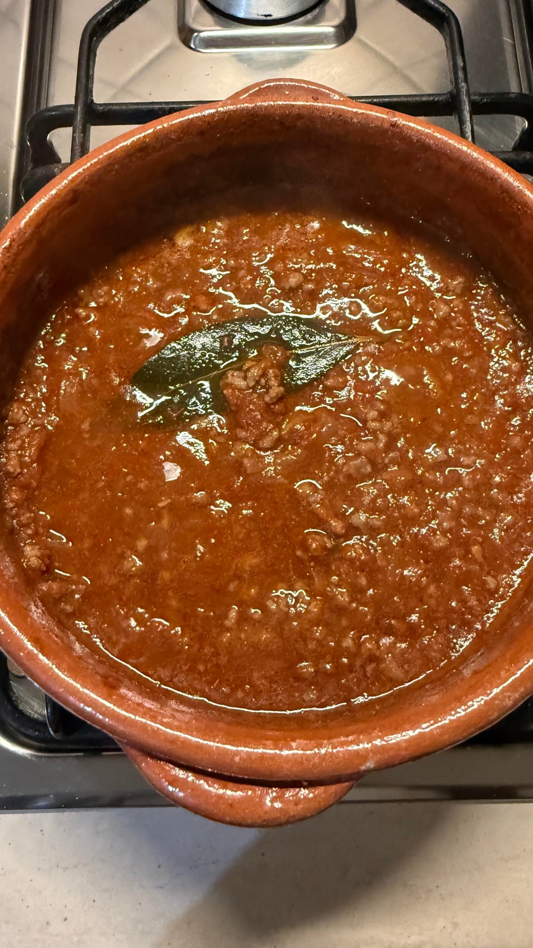 Cut the onion into strips and fry it with garlic. As soon as the onion has softened, add the minced meat and as soon as the water in the meat has evaporated, deglaze with red wine. When the alcohol evaporates, add tomato puree and cook over low heat for an hour