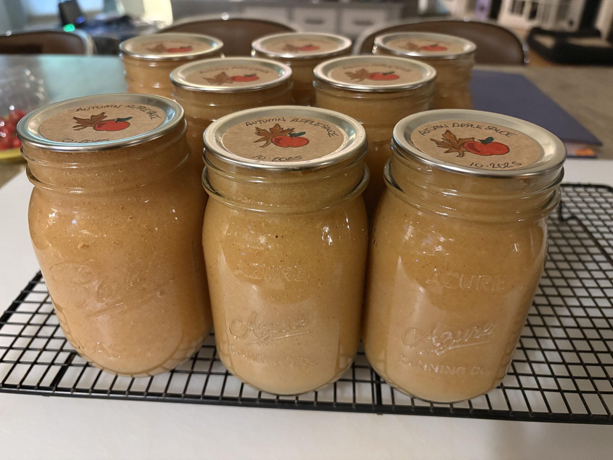 A photo shows eight mixed narrow mouth pint jars (Ball / AS / LE Ball) perched atop a black wire rack. Each jar is full of golden applesauce and sporting a hand-doodled label on the lid. If you look closely, you can see flecks of cinnamon or nutmeg in a few of the jars.