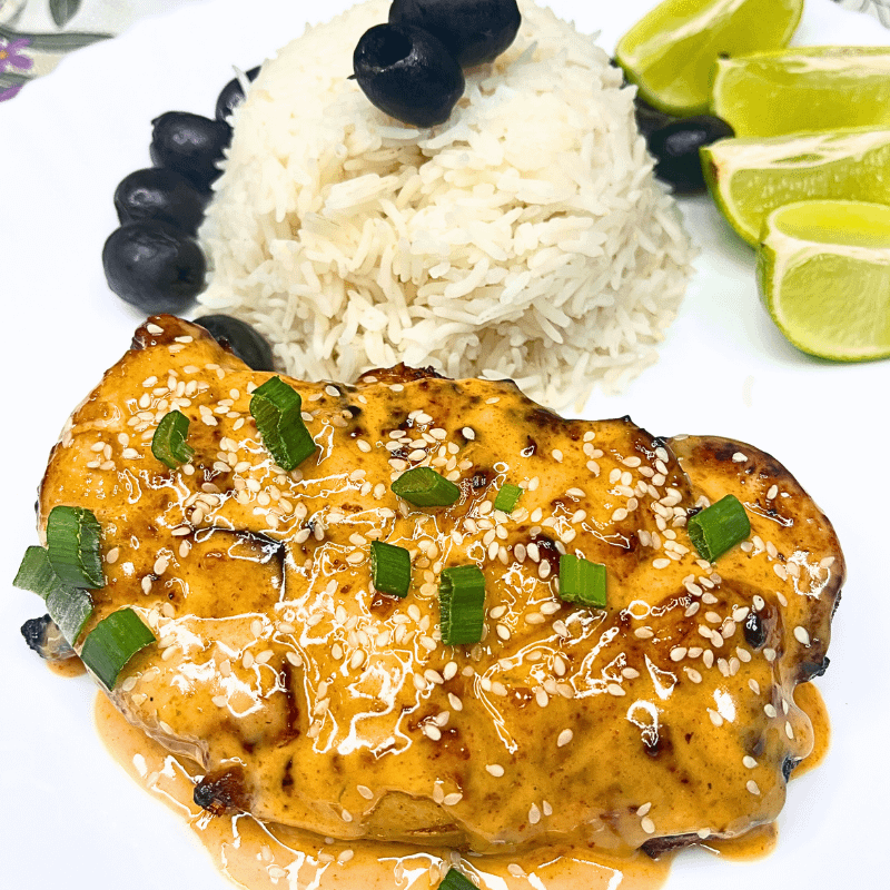 Coat the chicken with spicy rub, make the bang bang sauce and baste the chicken. Cook for 15 minutes and enjoy. [Here’s the full written recipe](https://cookingfrog.com/bang-bang-chicken-breast/).