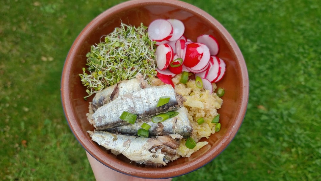 Waitrose store brand sardines in spring water, they're my favourite for a cheap, filling and very nutritios combination. I broke a 24h fast with this meal: cous cous, sprouts, radishes and sardines and a drizle of chilli sauce