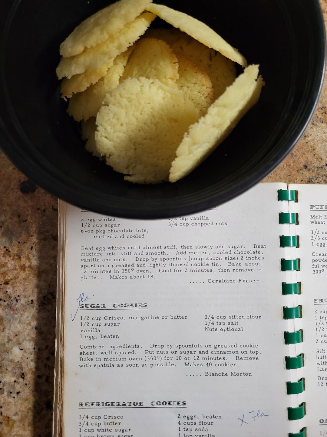 I wish my handwriting was half as good as hers, because I want to start adding comments too. Because last night's sugar cookies, I got 24, not 40! Mrs. Morton must have had small spoons. I tried 1/2 tsp orange bakers emulsion instead of vanilla –yum.