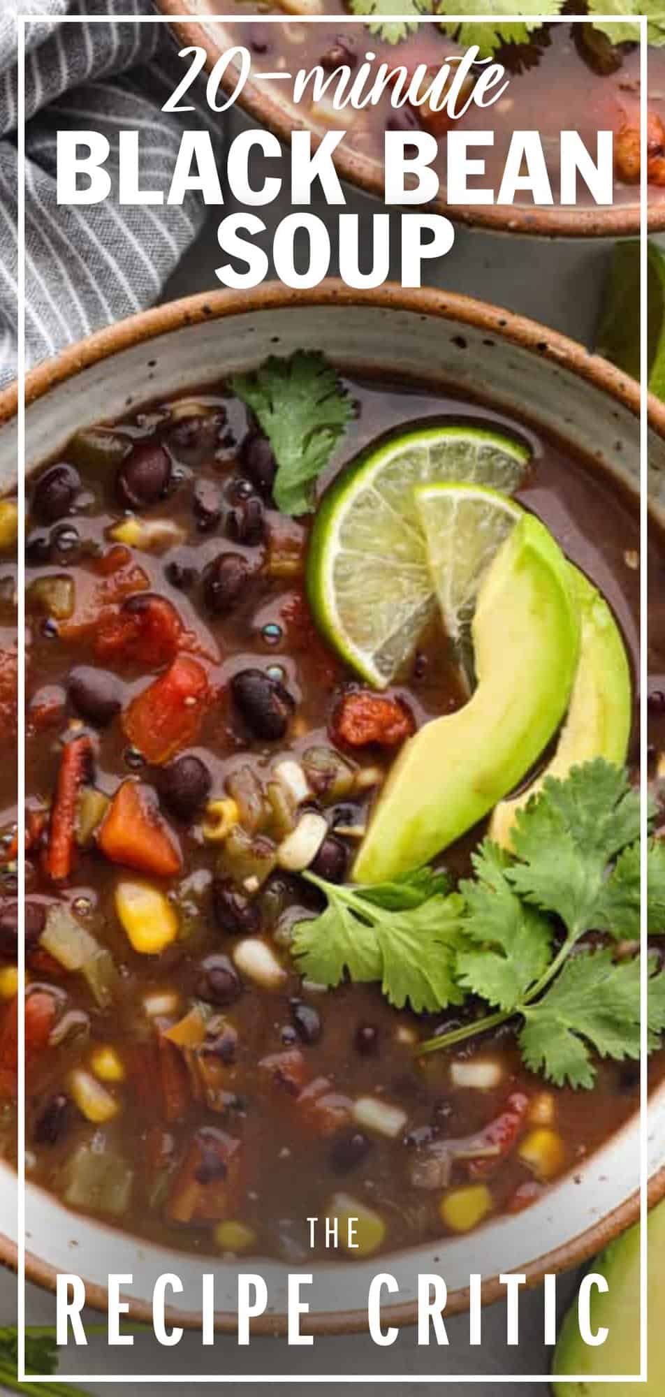 A super easy 20-minute black bean soup! This soup is hearty and filling and a great option for those wanting a vegetarian option! It’s made with black beans, a variety of veggies, and delicious seasonings for a savory soup with a hint of warm spice!