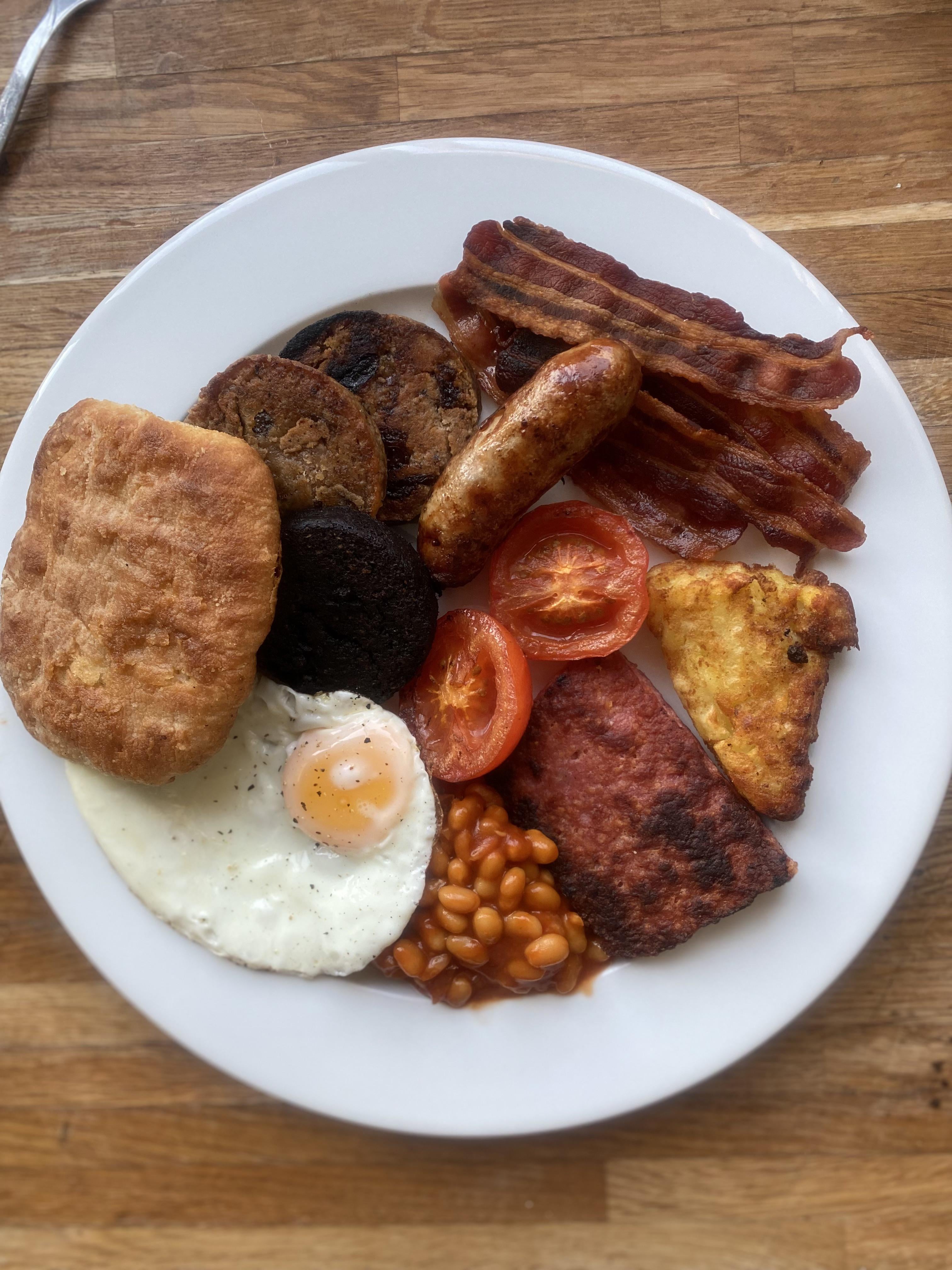 Scottish fry with some fruit pudding and a buttery