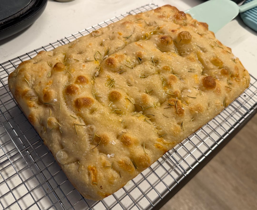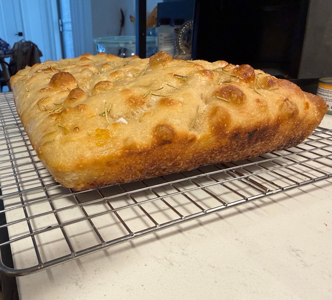 Preheat oven to 430F, take out the dough and rest on top of oven to bring temp up. Once the dough is warm enough to jiggle, drizzle some oil, coat your fingers in it, and dimple. I added dried rosemary to the oil pools since it tends to burn if not covered in oil. I baked for 22 min then took it out, but next time I may move it to a higher baking rack and let it bake for a bit longer to brown the top more. Take out, drizzle with olive oil and flakey sea salt, let cool on a rack for 20 min then enjoy! I particularly like it with balsamic vinegar.