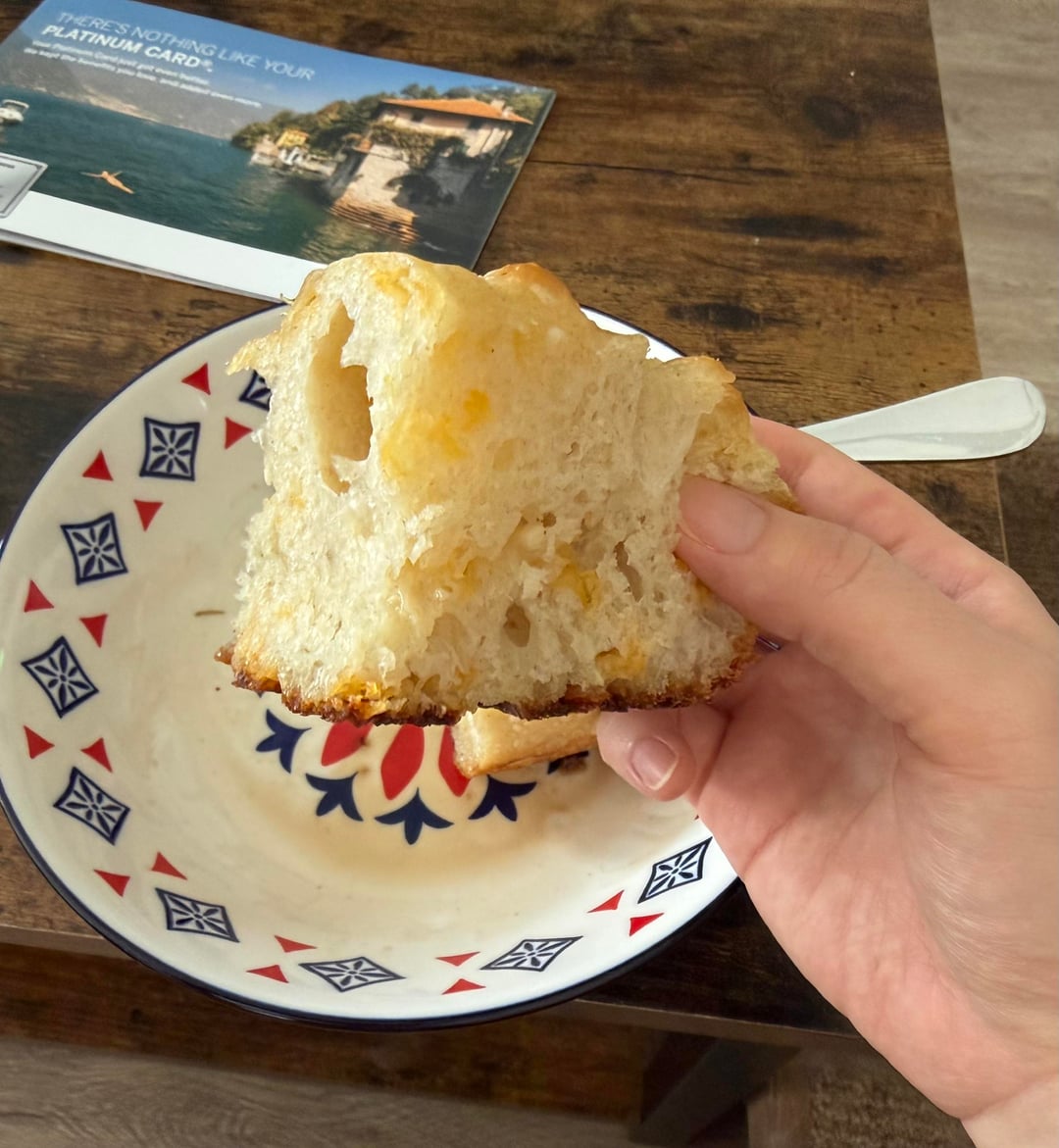 I’m pretty happy with how this turned out! I baked it on the lowest rack, but I may move it up after 20 min to brown the top more without burning the bottom. I incorporated minced garlic and shredded cheddar during the stretch and fold process, making sure the toppings are fully encased by the dough. After incorporating the toppings, I started using coil folds instead.